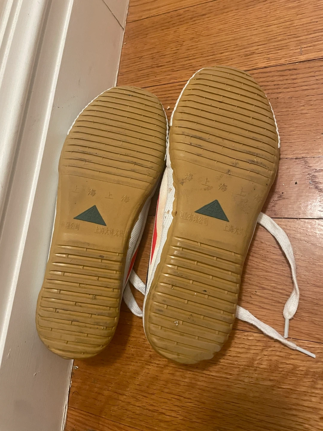 Classic white Feiyue canvas sneakers with red and blue accents. These shoes are a size 43 or 265mm. Durable rubber sole.