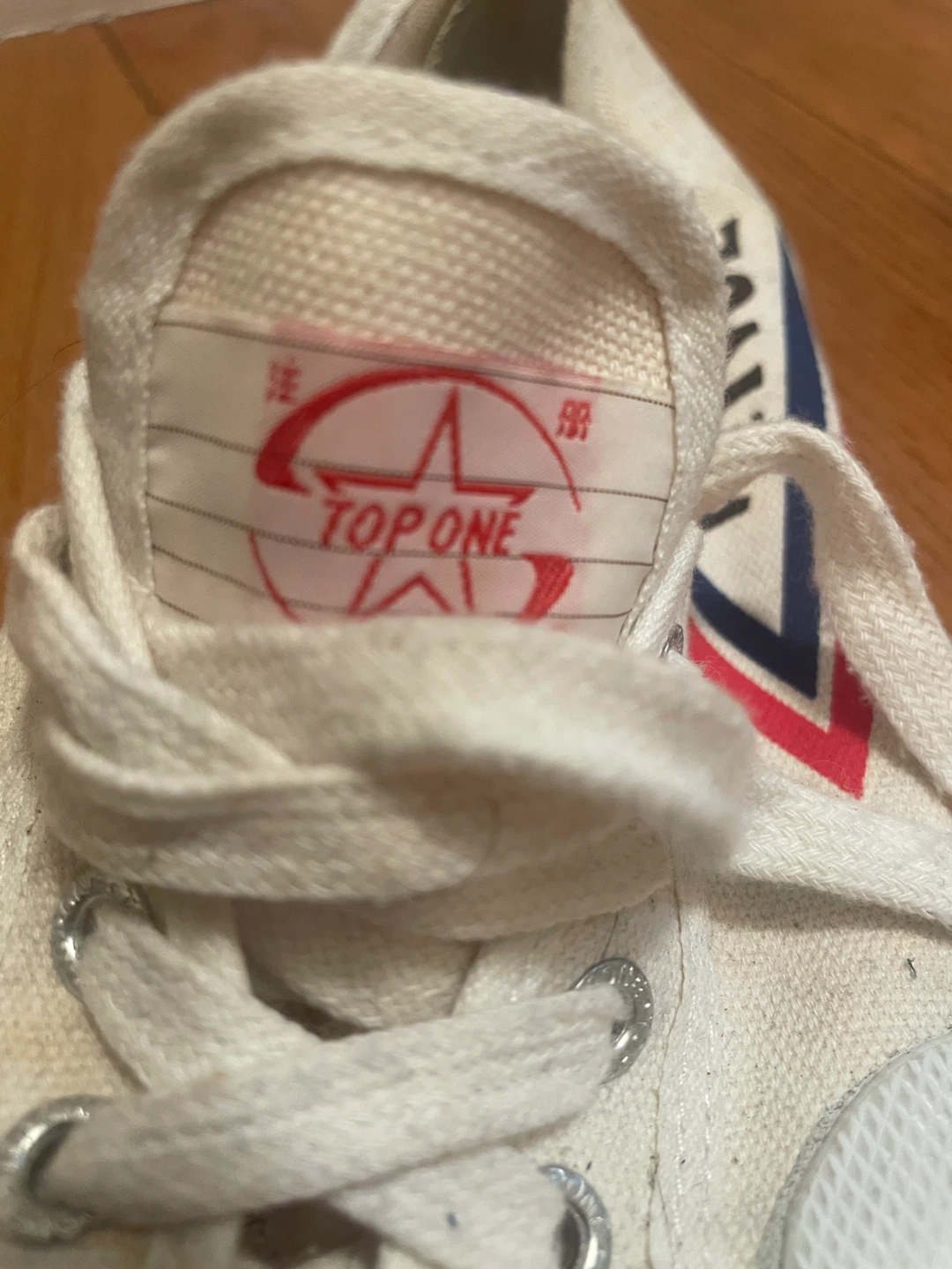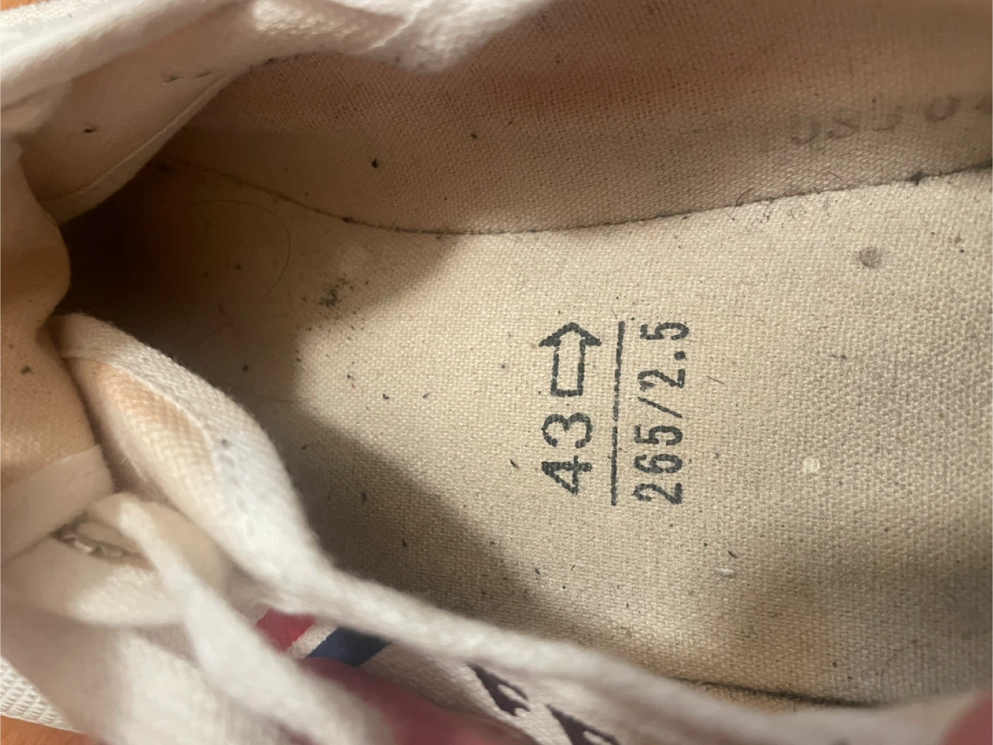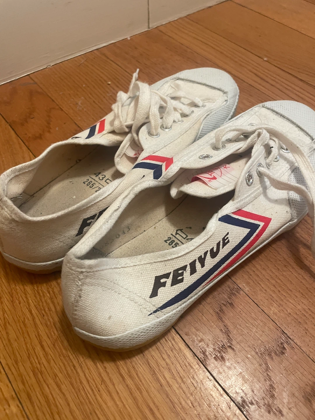 Classic white Feiyue canvas sneakers with red and blue accents. These shoes are a size 43 or 265mm. Durable rubber sole.
