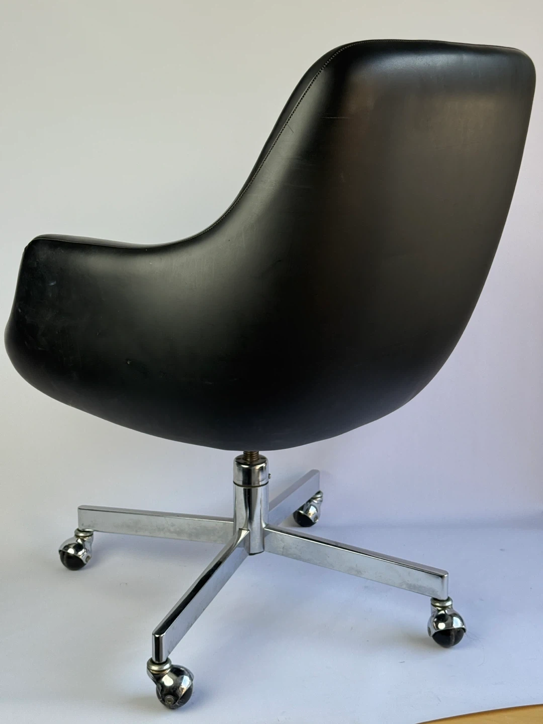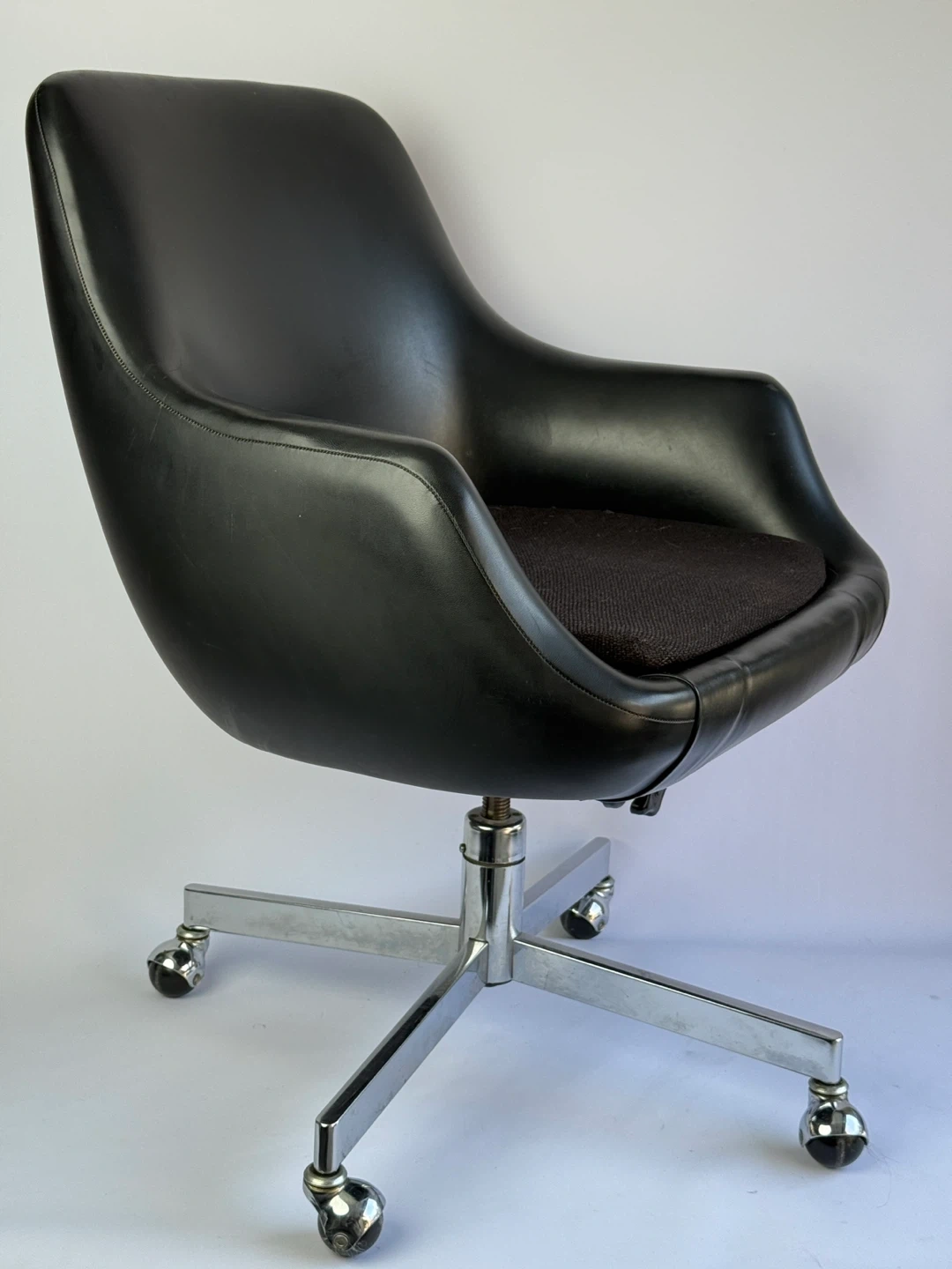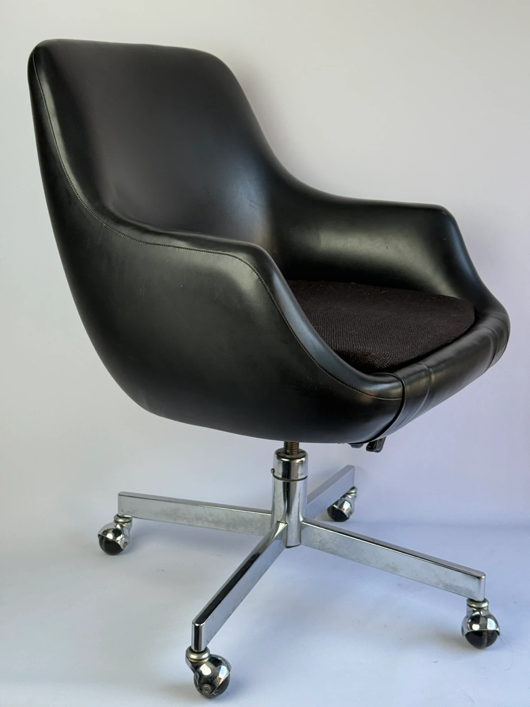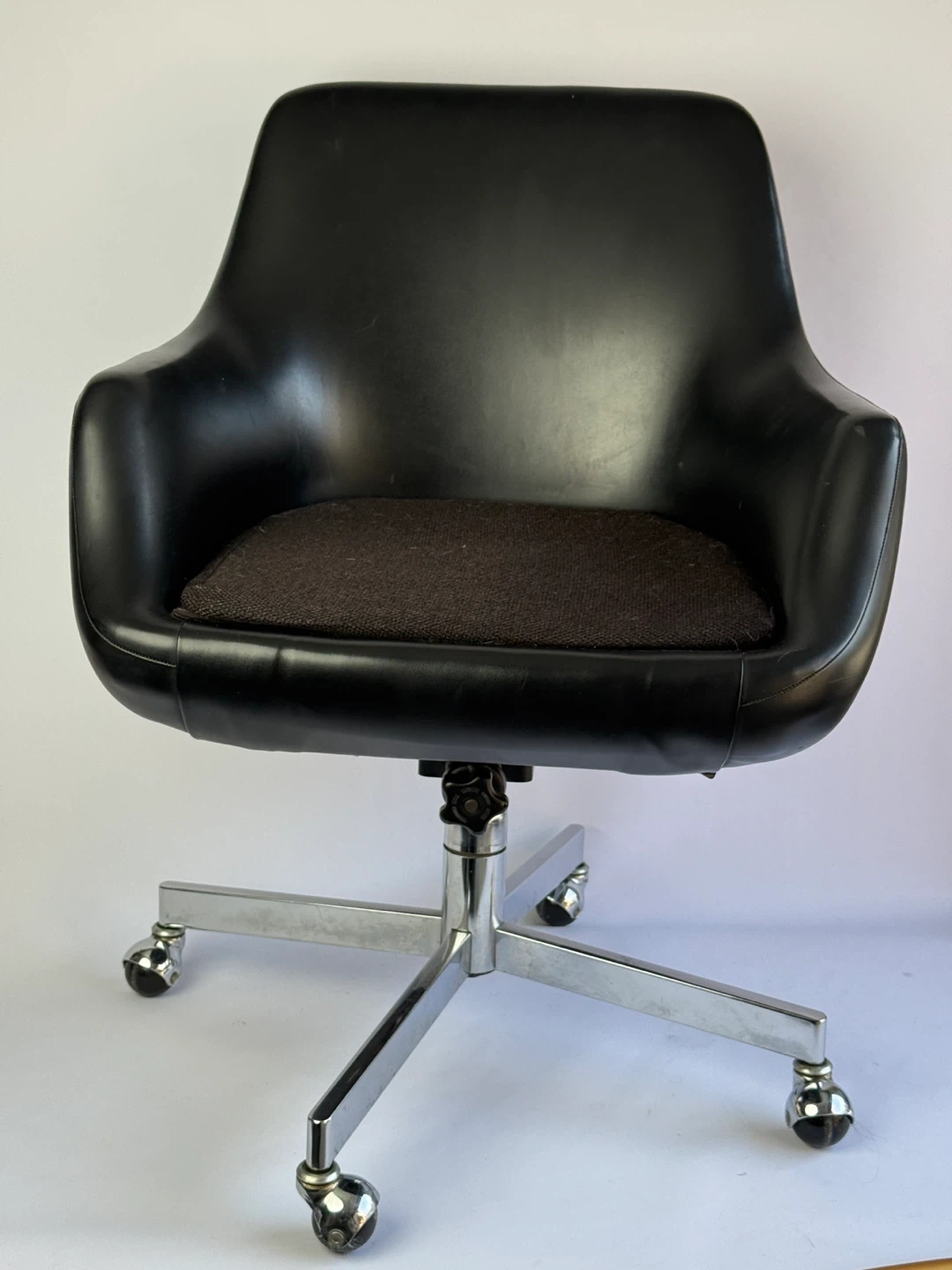 This is a black office chair with a swivel base and casters. It has a padded seat with a textured fabric cushion. The chair's shell is made of a smooth, durable material. It's designed for comfort and mobility in a workspace.