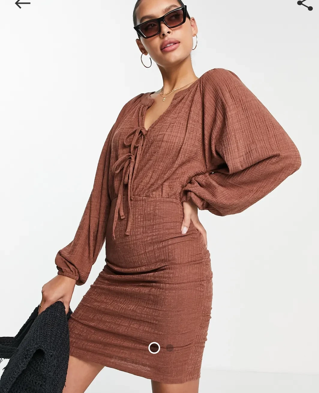 Here's a cute brown mini dress from ASOS Design! It features long sleeves and a tie detail at the front. Perfect for a casual day out or dressing up for an evening!
