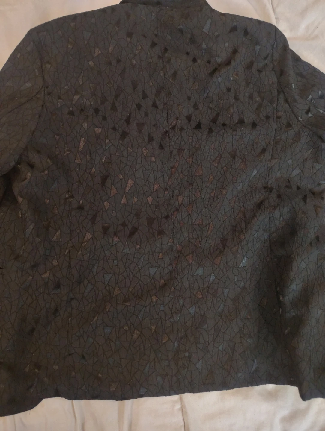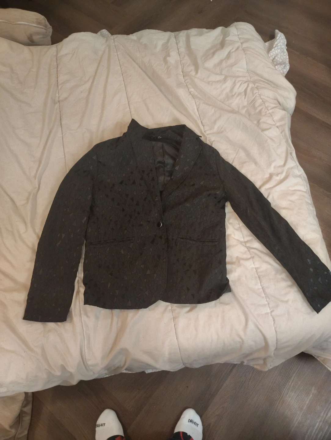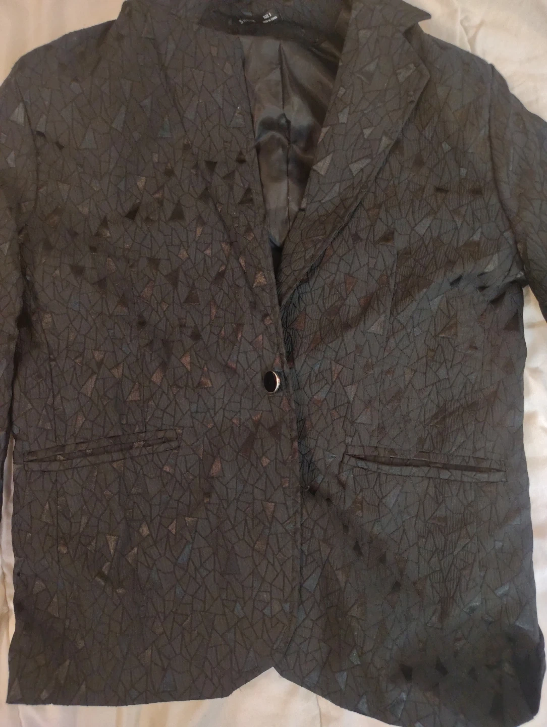 Size small Shein brand women's blazer with a unique textured pattern. It features a single button closure and has a smooth inner lining. Great for dressing up an outfit!