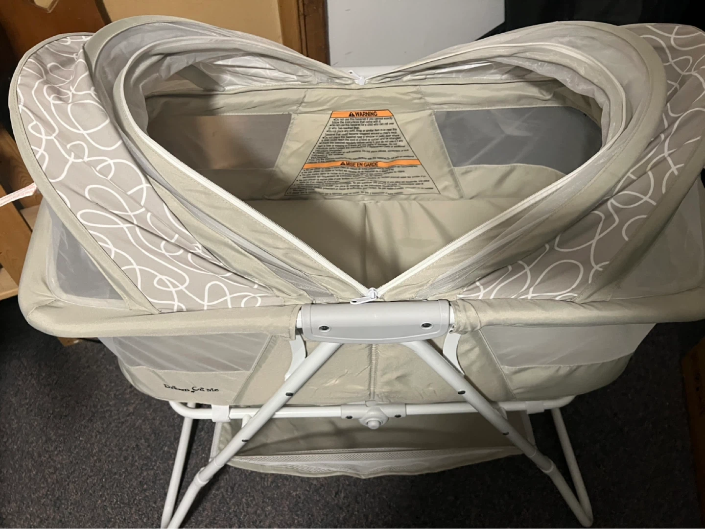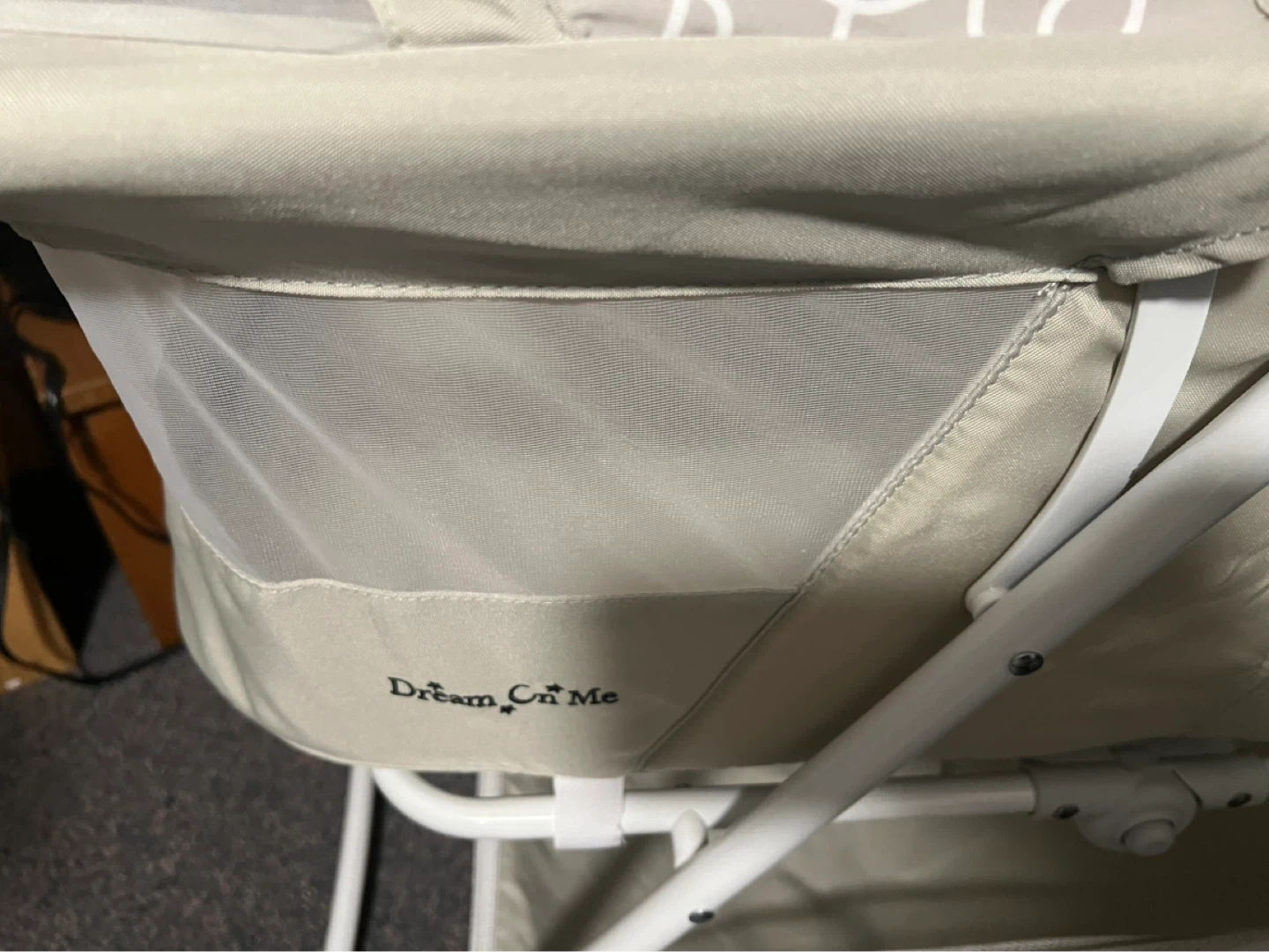 Dream On Me bassinet in a neutral beige colour. It features mesh sides for ventilation and a canopy. Perfect for keeping your little one close by during naps.