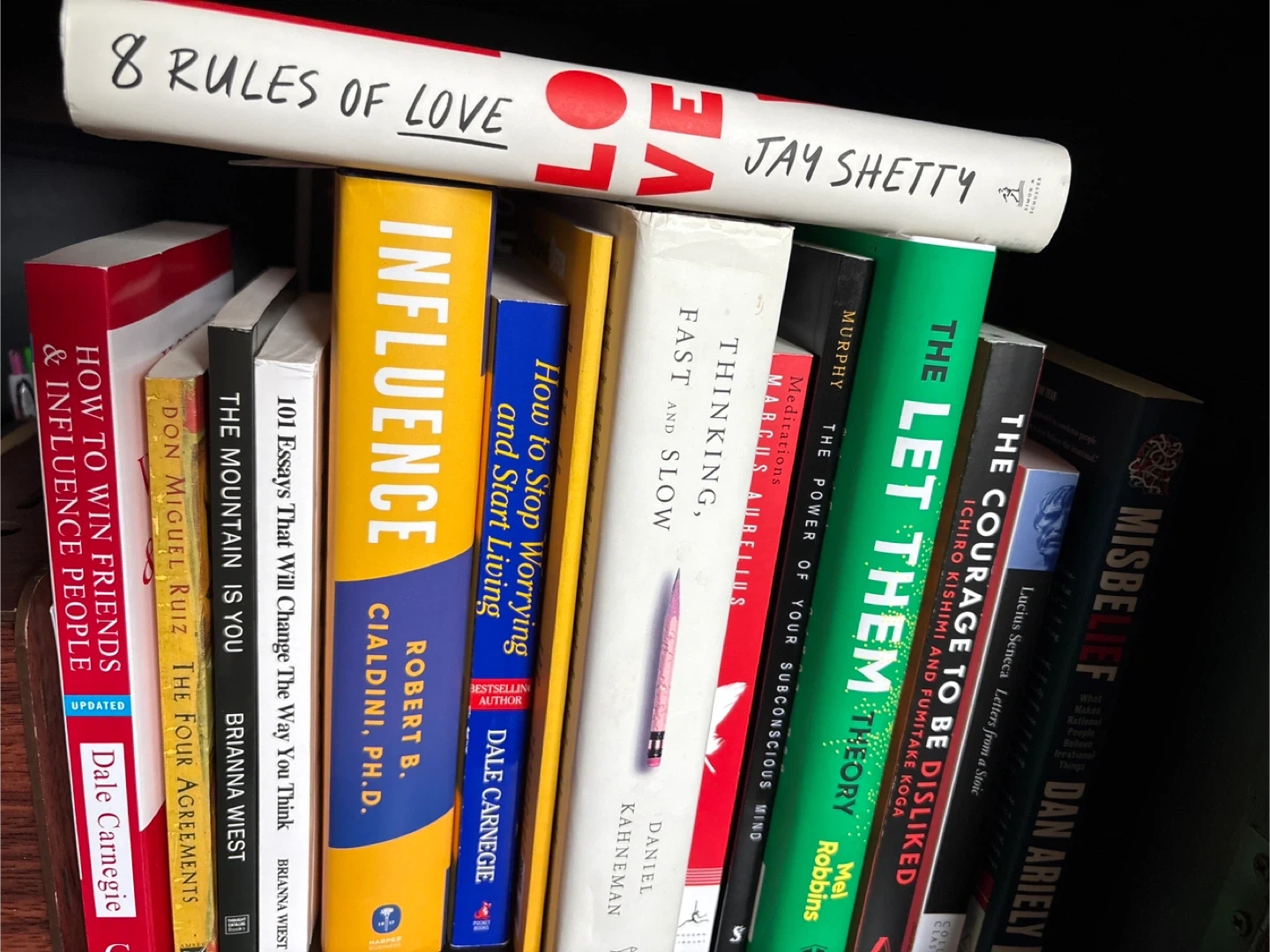 Titles include works by Dale Carnegie, Robert Cialdini, Daniel Kahneman, Jay Shetty, and others. These books cover topics like influence, personal growth, and psychology.