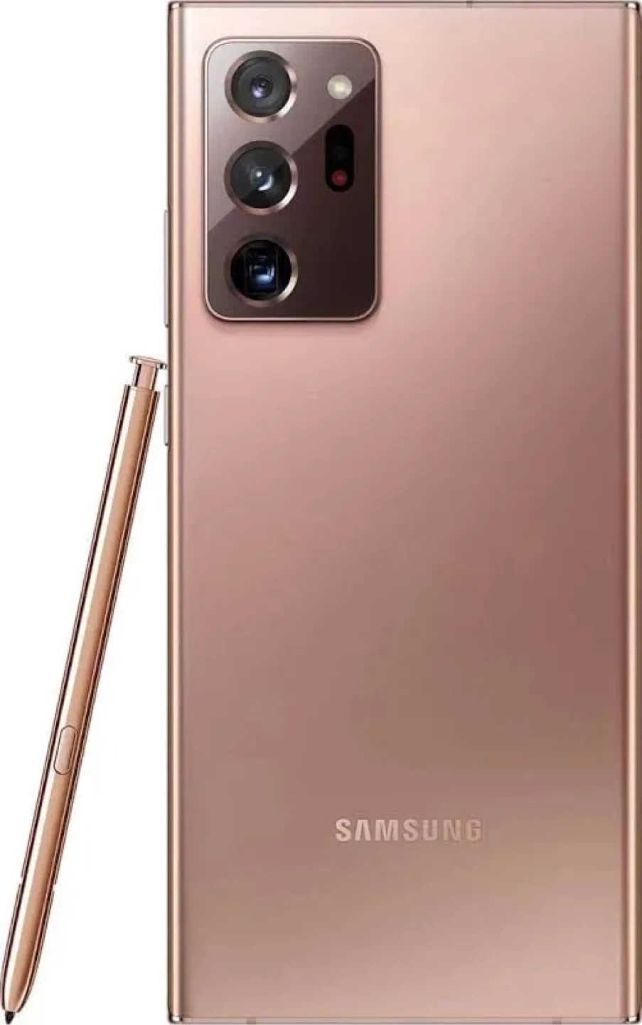 Samsung Galaxy Note 20 Ultra 5G smartphone in a rose gold colour. Includes the S Pen stylus. It's a powerful device with a great camera system!