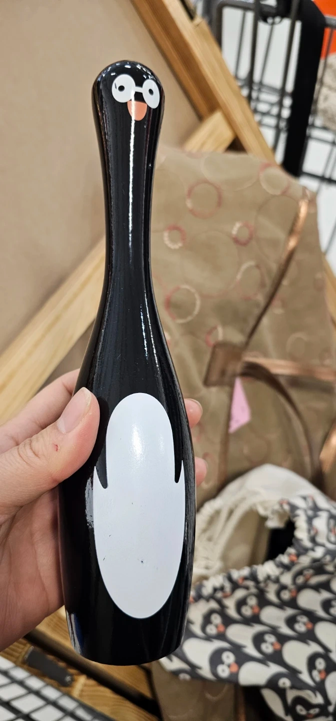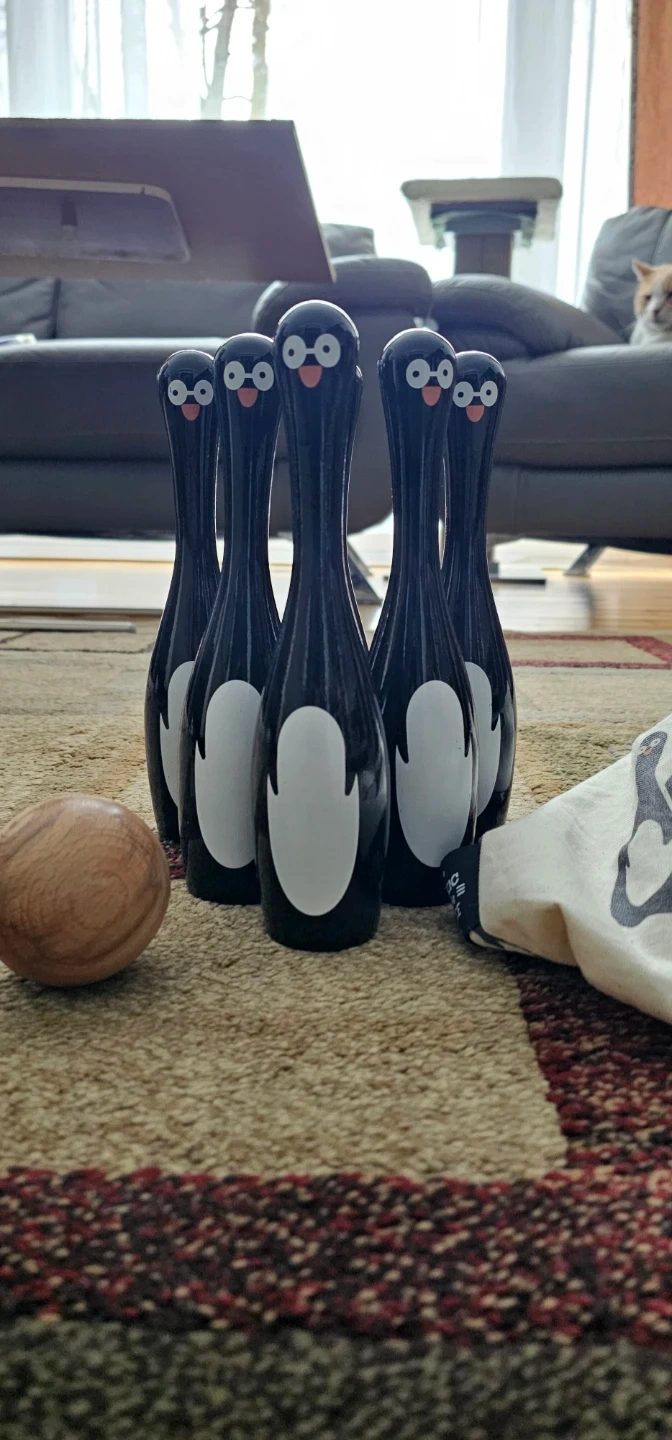 This fun wooden bowling set features a playful penguin design. It includes six pins and one ball, all made from durable wood. Suitable for kids aged 3 and up!