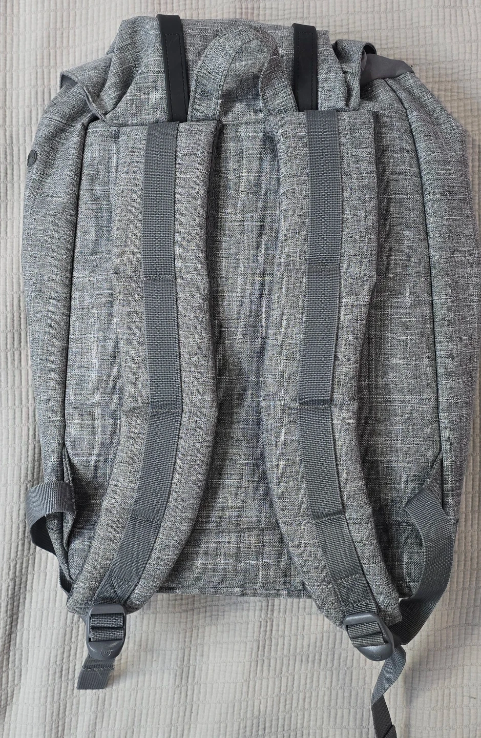 This grey Herschel backpack features a roll-top closure and a "Vancouver's North Shore" graphic. It has a padded laptop sleeve inside. It's made with durable fabric and black accents.