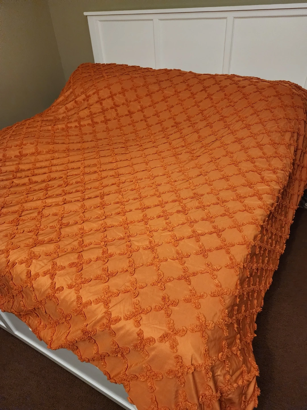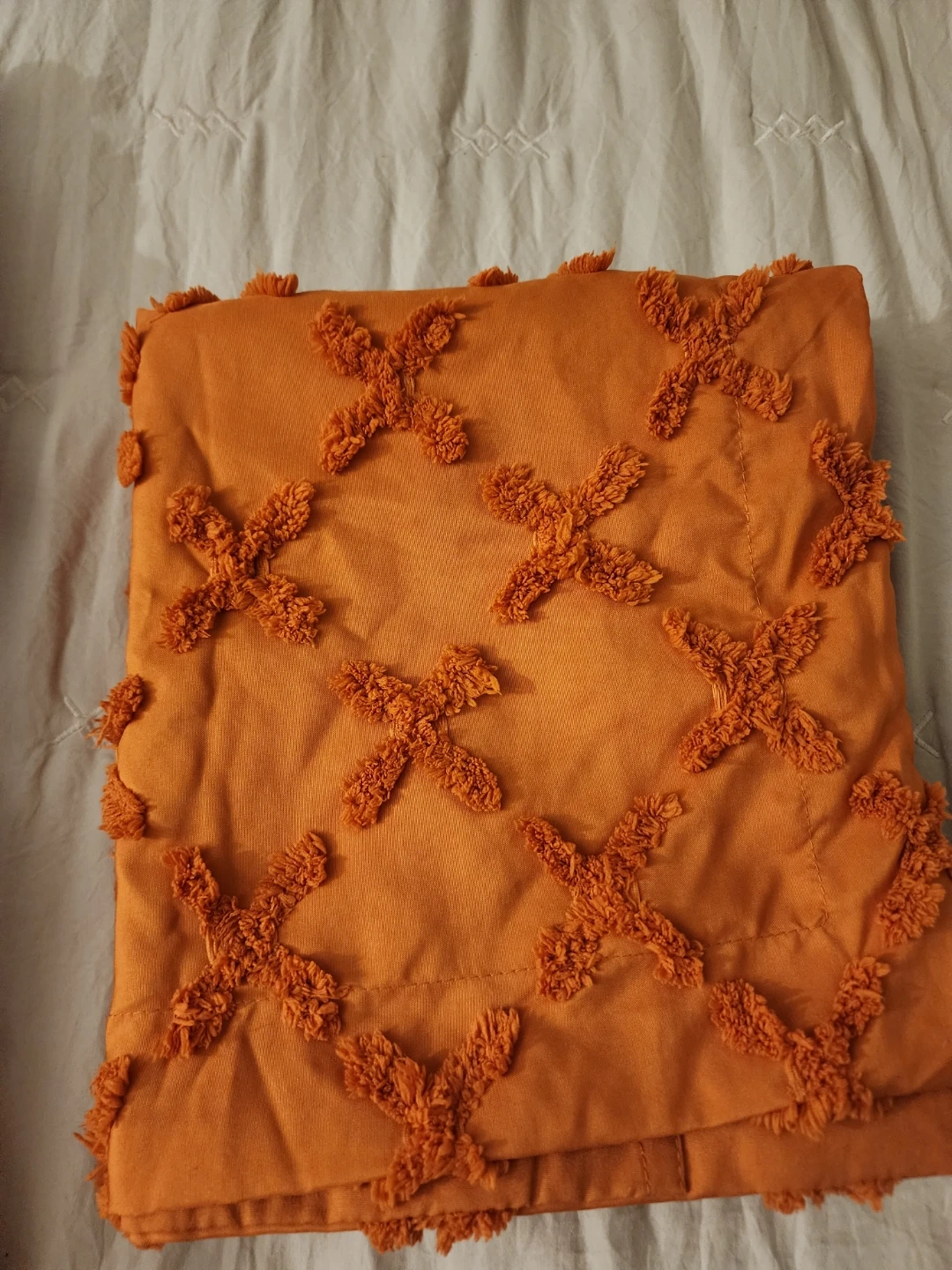 Selling a cozy orange tufted chenille comforter set. It's in great condition and features a unique textured design that adds a touch of warmth to any bedroom. Perfect for adding a pop of color and comfort to your bedding!. King🥕