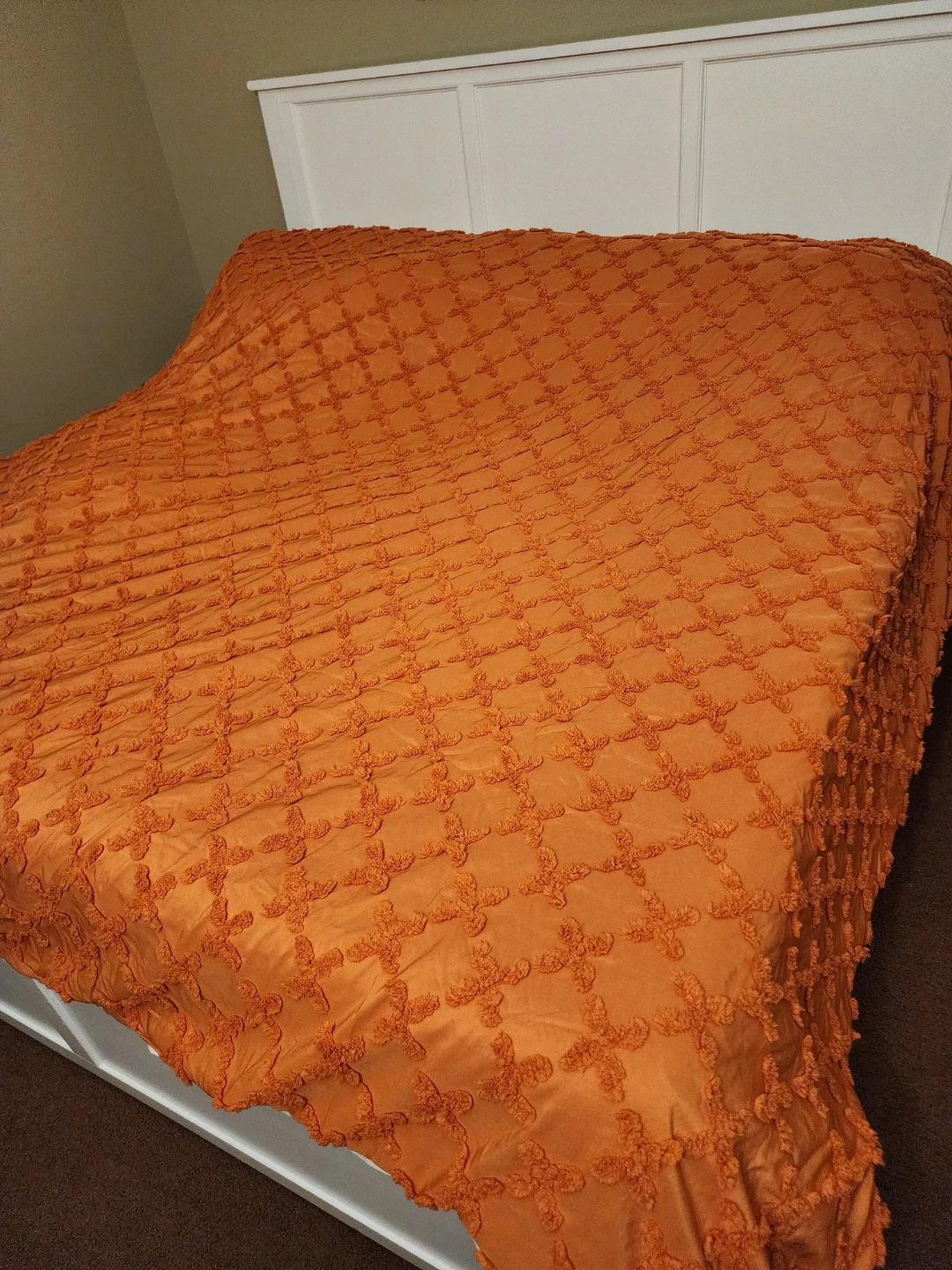 Selling a cozy orange tufted chenille comforter set. It's in great condition and features a unique textured design that adds a touch of warmth to any bedroom. Perfect for adding a pop of color and comfort to your bedding!. King🥕