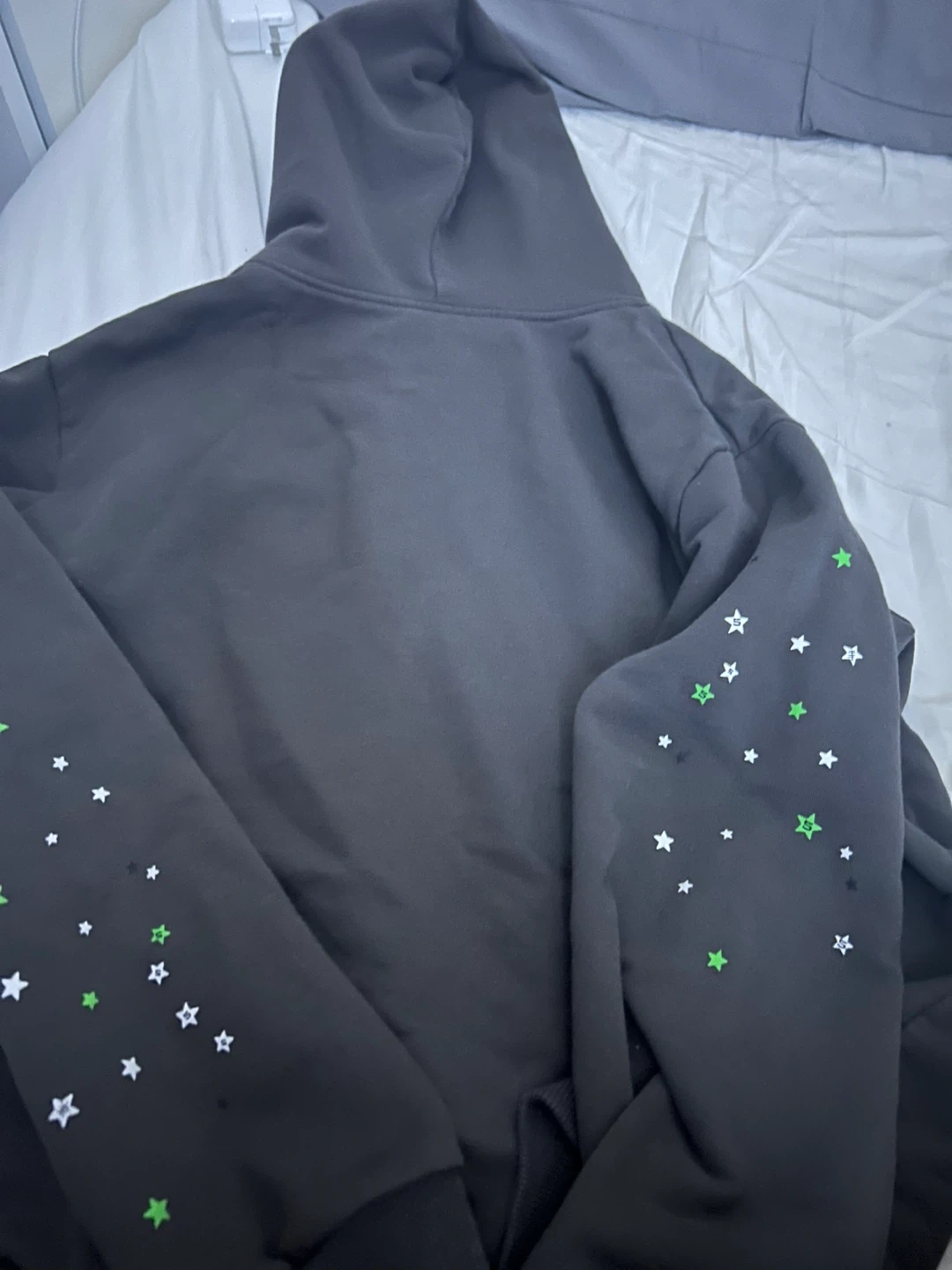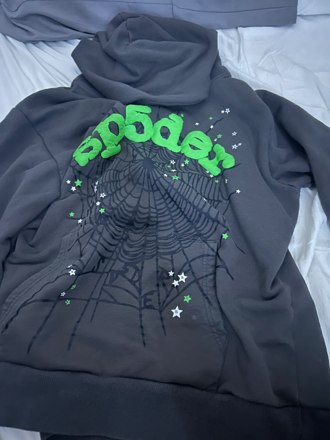 This is a Spider hoodie with a spiderweb graphic. It's made of 100% cotton. Machine wash cold, tumble dry low. LOWEST I CAN DO 70 or 65
