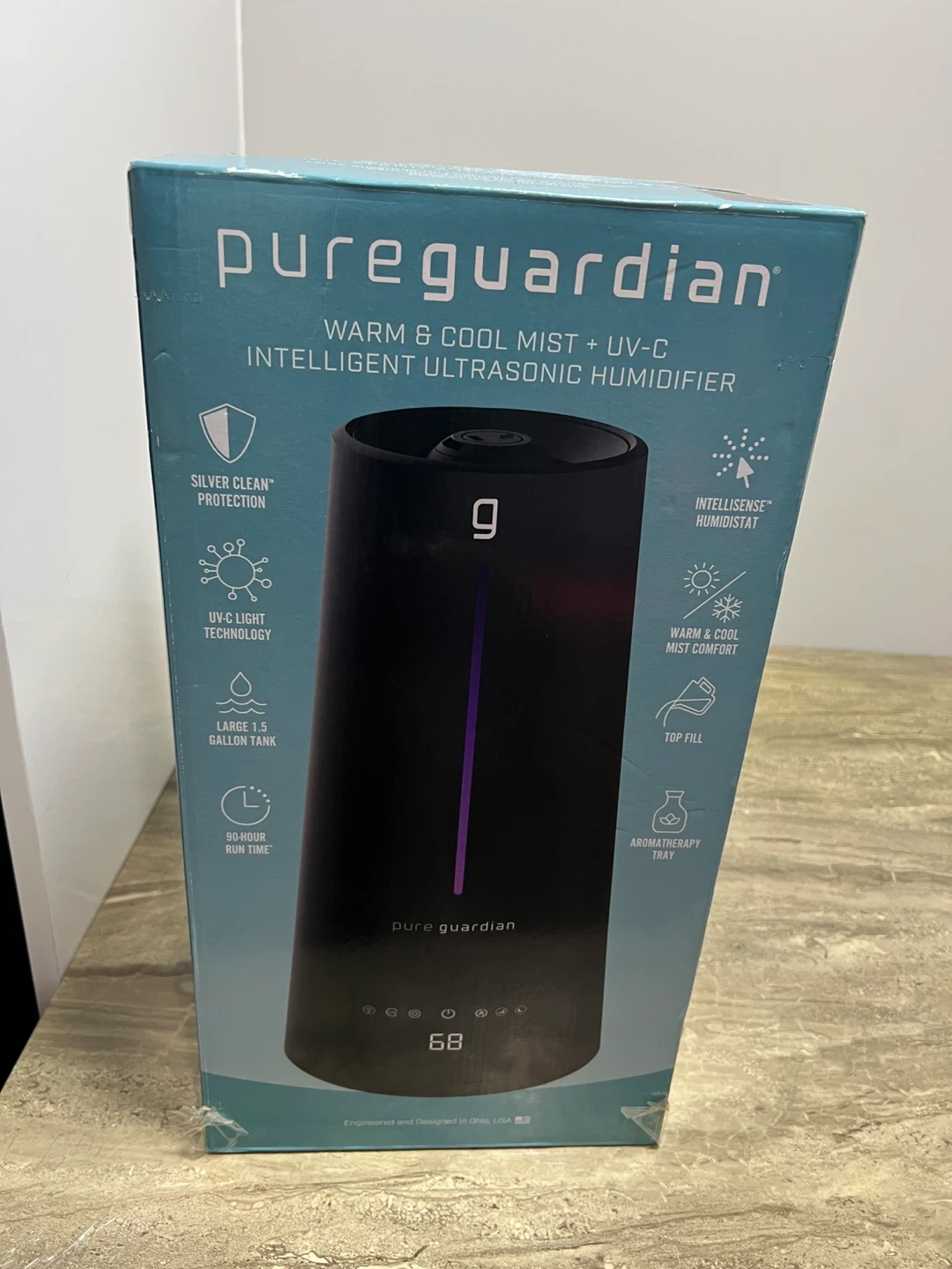 PureGuardian warm and cool mist humidifier with UV-C light technology. It features a 1.5-gallon tank for up to 90 hours of run.