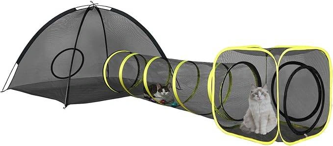 All pieces work together as a full setup or separately. Tunnel and playhouse pop up in seconds, tent takes about a minute. Works outside in the backyard, camping, or picnics, or inside as a cozy cat house or nursery.