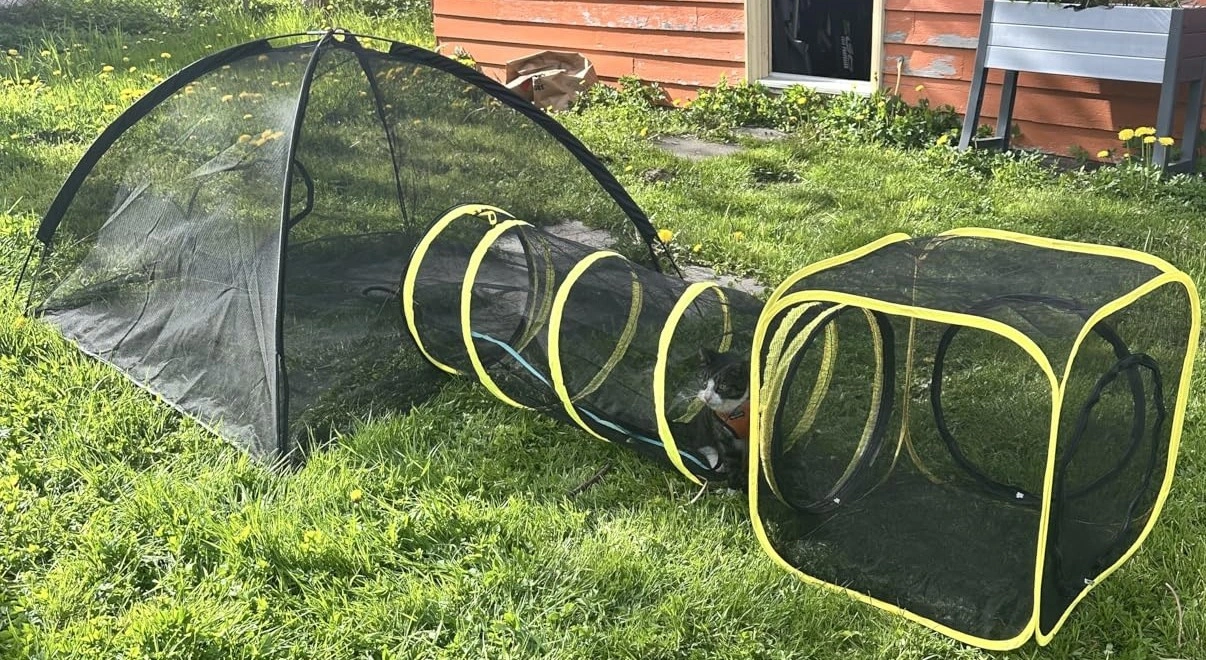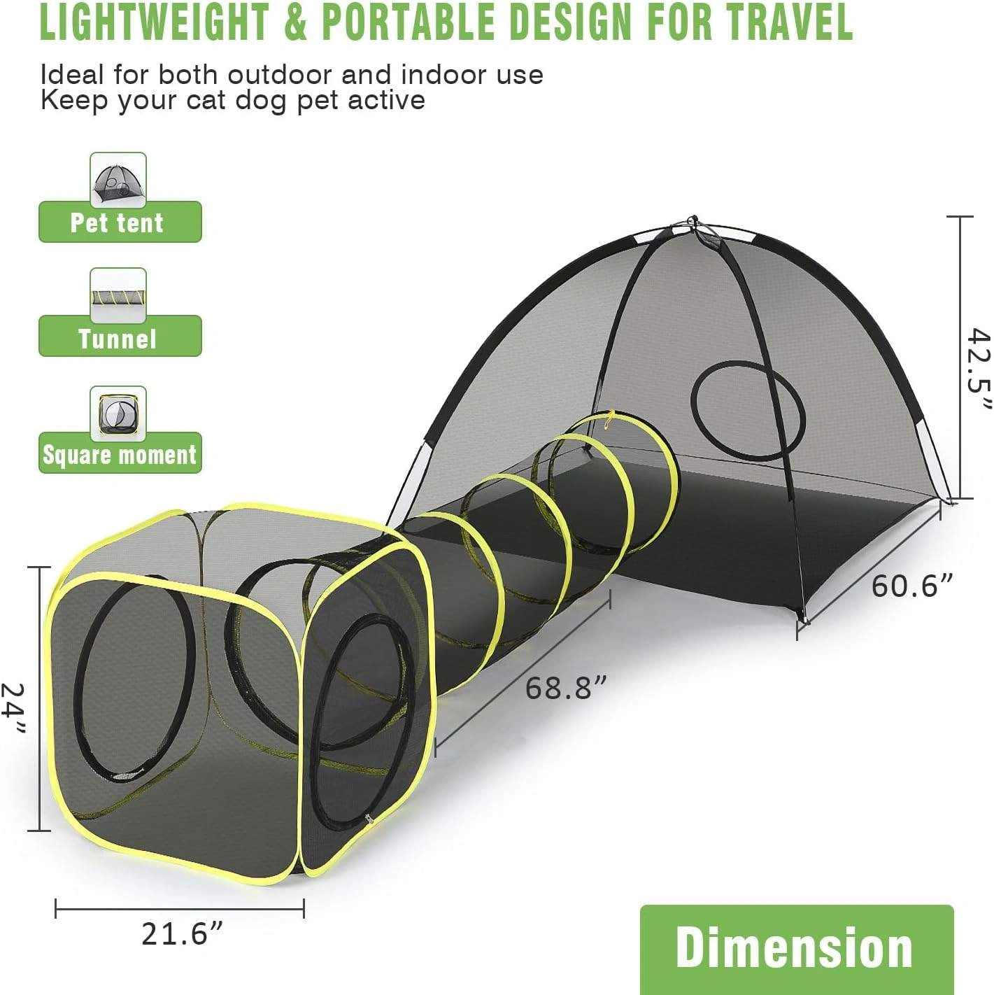 All pieces work together as a full setup or separately. Tunnel and playhouse pop up in seconds, tent takes about a minute. Works outside in the backyard, camping, or picnics, or inside as a cozy cat house or nursery.