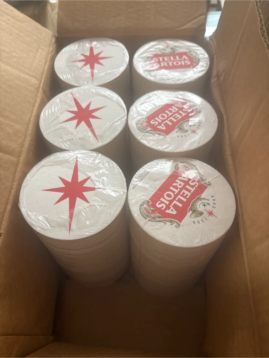 STELLA ARTOIS ICONIC REFRESH – COASTER Features Round Coasters with the Stella logo on one side and a red star pattern on the other side made of cardboard material 125 coaster per Sleeve. 6 sleeves total