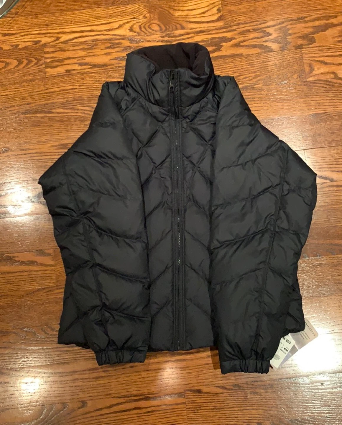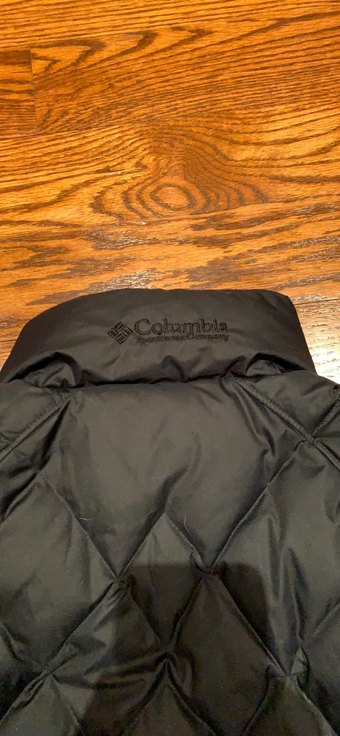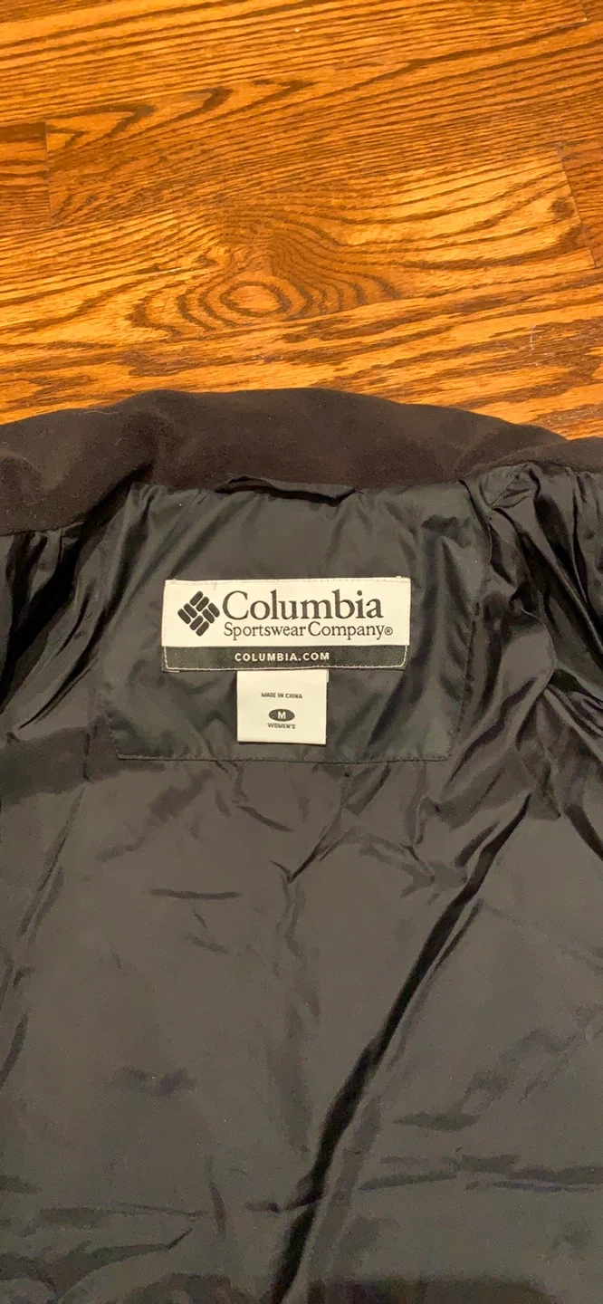 This black Columbia puffer jacket is a size medium. It's made with a 100% polyester shell and lining, and filled with down/feathers. It's great for keeping warm when it's chilly out!