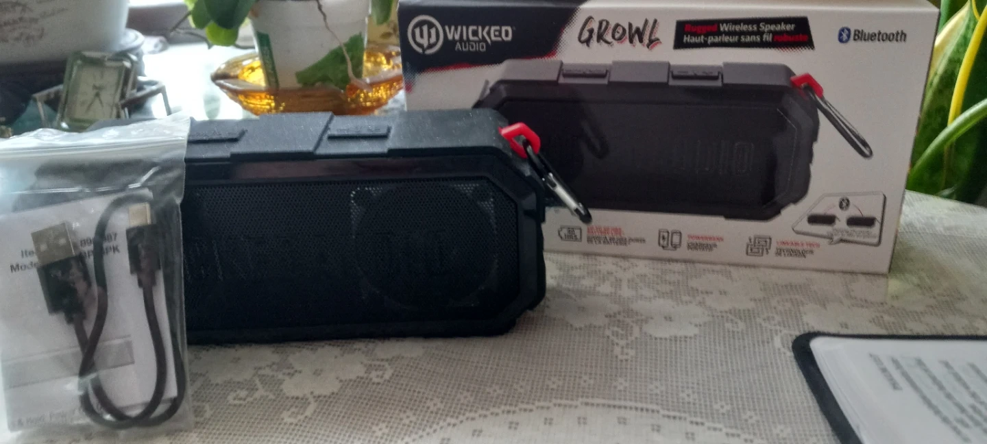 This is a Wicked Audio GROWL rugged wireless speaker. It's Bluetooth enabled and comes with a USB charging cable. It's built for outdoor use and is water-resistant. Perfect for camping or outdoor adventures! Brand New...cannot figure out how to use..