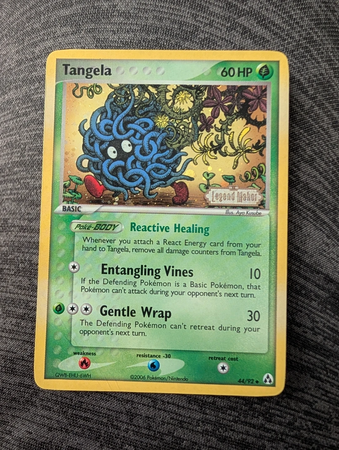 This is a Pokemon trading card featuring Tangela. The card has 60 HP and the 'Reactive Healing' Poke-Body ability. It has two attacks: 'Entangling Vines' and 'Gentle Wrap'.