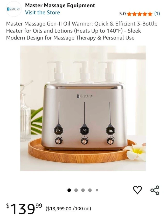Never used. Master Massage Gen-II Oil Warmer. This Master Massage Oil Warmer simplifies the process with precise heating and temperature control. The digital display shows the exact temperature, ensuring your products reach the perfect warmth every time! Designed for quick and hassle-free heating, this oil warmer fully heats your products in just 20 minutes. With an adjustable dial ranging from 104°F to 140°F, simply fill the bottles, insert them into the warmer, and turn it on for fast results! The 3-bottle Massage Oil Warmer can hold three different types of lotions or oils, heating each to its own ideal temperature. This convenient feature allows you to personalize the massage experience while saving space. Warming massage oil is effortless with its sleek, modern design and durable ABS plastic construction. The robust pumps dispense the perfect amount of product, and the unit plugs in for use in any room. Plus, enjoy peace of mind with an auto safety shutoff after 8 hours. Whether you’re a professional massage therapist or a home user, this oil warmer is essential for achieving the perfect temperature every time. Elevate your massage experience with this convenient and reliable tool! For Sale By: Owner