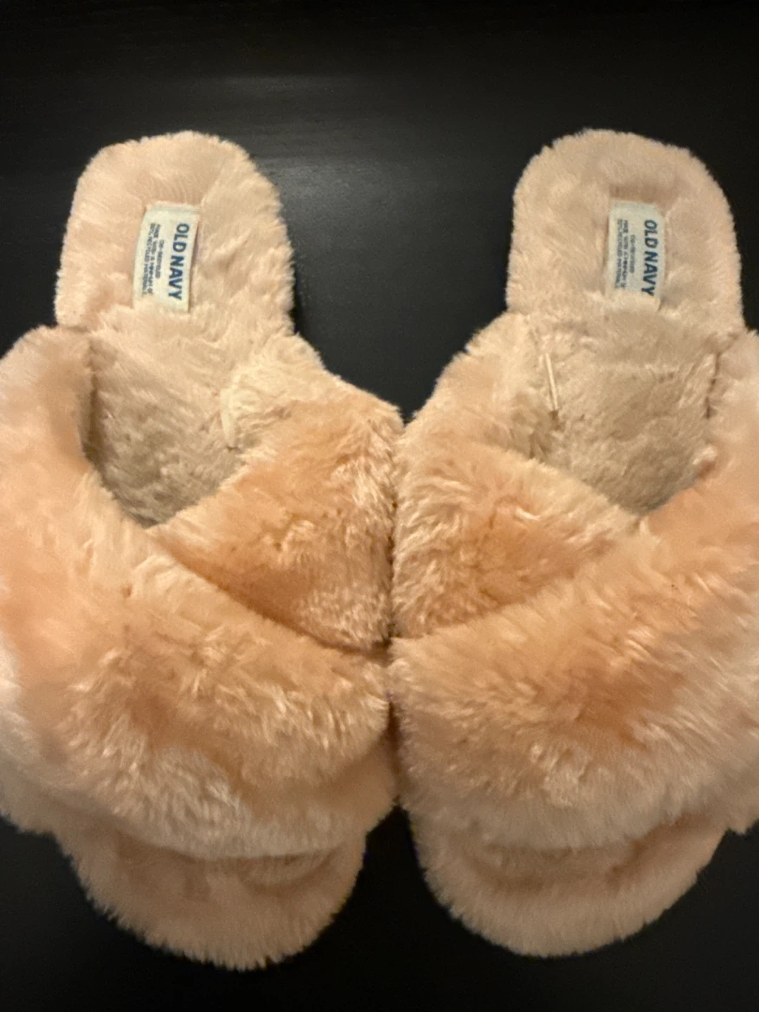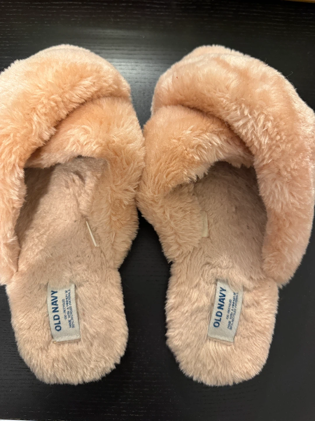 Snuggle up in these Old Navy criss-cross faux-fur slippers! They're super soft and cozy, perfect for lounging around the house. The color is a lovely blush pink. The slippers are in great condition and ready to keep your feet warm!