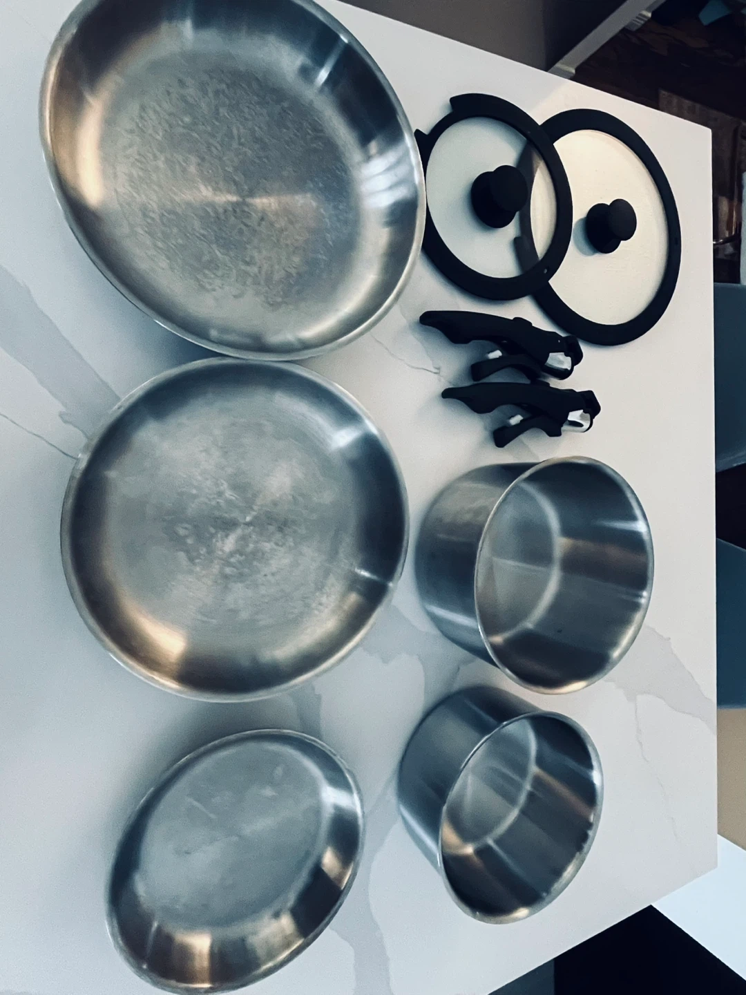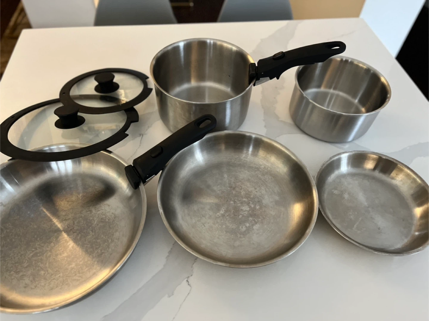 This set includes a frying pan, a saucepan with a lid, and two small pots. All pieces are made of stainless steel with black handles. Two additional glass lids with black rims and handles are also included.