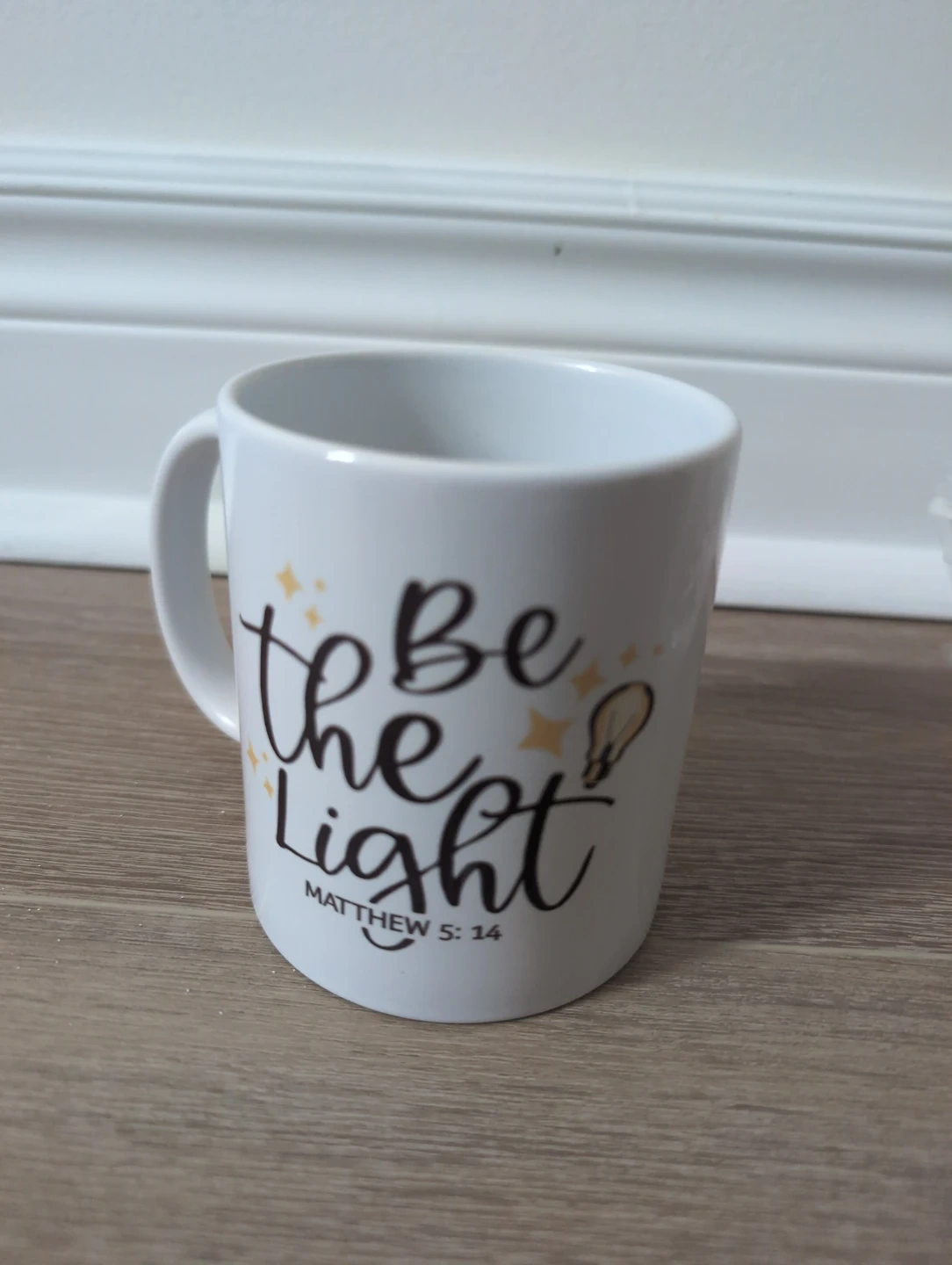 White ceramic mug with "Be the Light" graphic and Matthew 5:14 text. It's a standard mug size. This mug's message is uplifting. It's great for enjoying your favourite hot beverage!