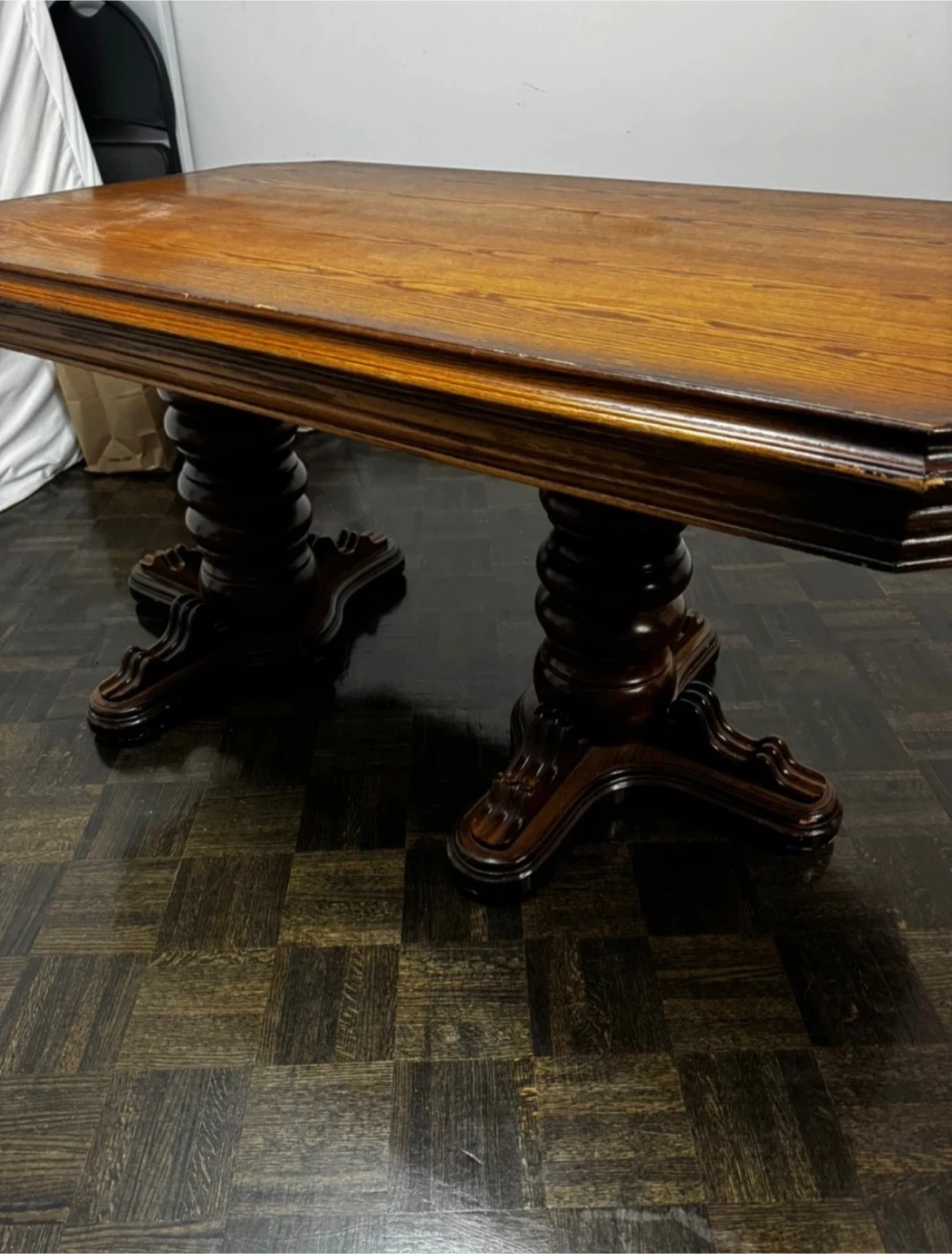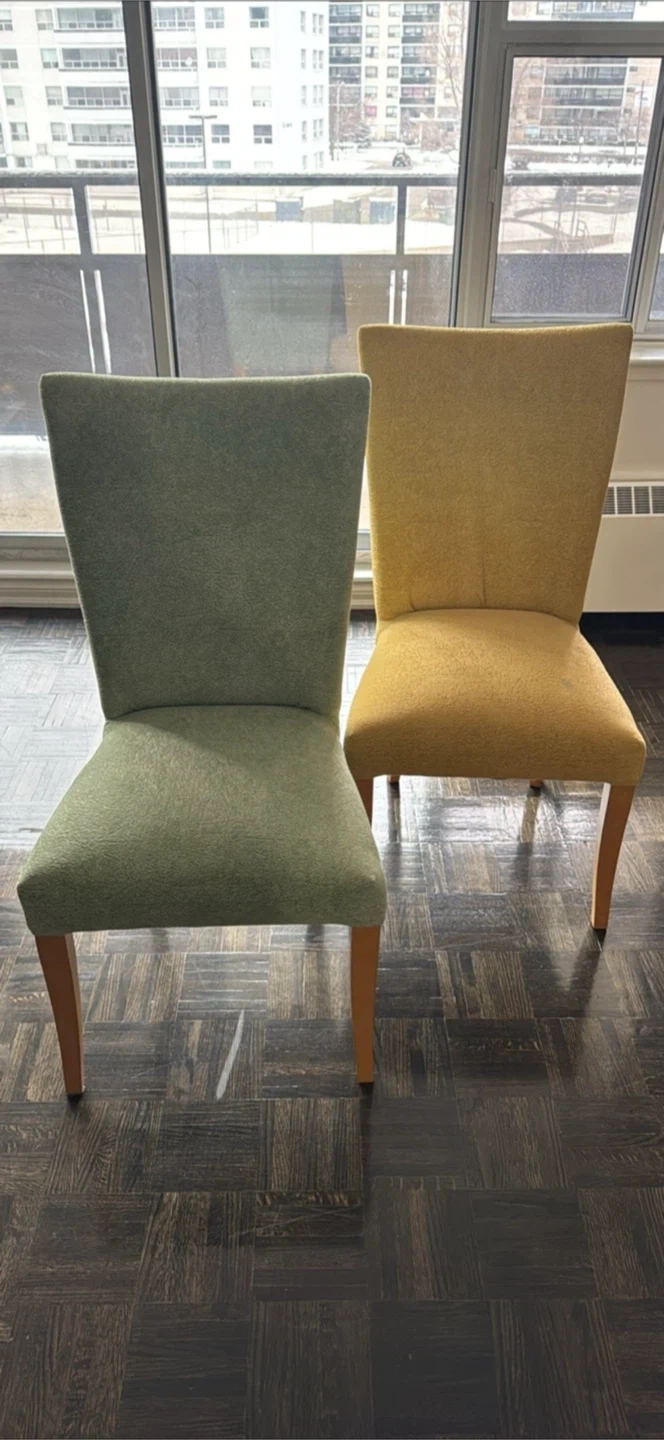 This set includes a sturdy wooden dining table with ornate legs and four upholstered chairs in green and yellow. The table has a classic wood grain finish and an octagonal shape. Chairs offer comfortable seating for family dinners or gatherings.