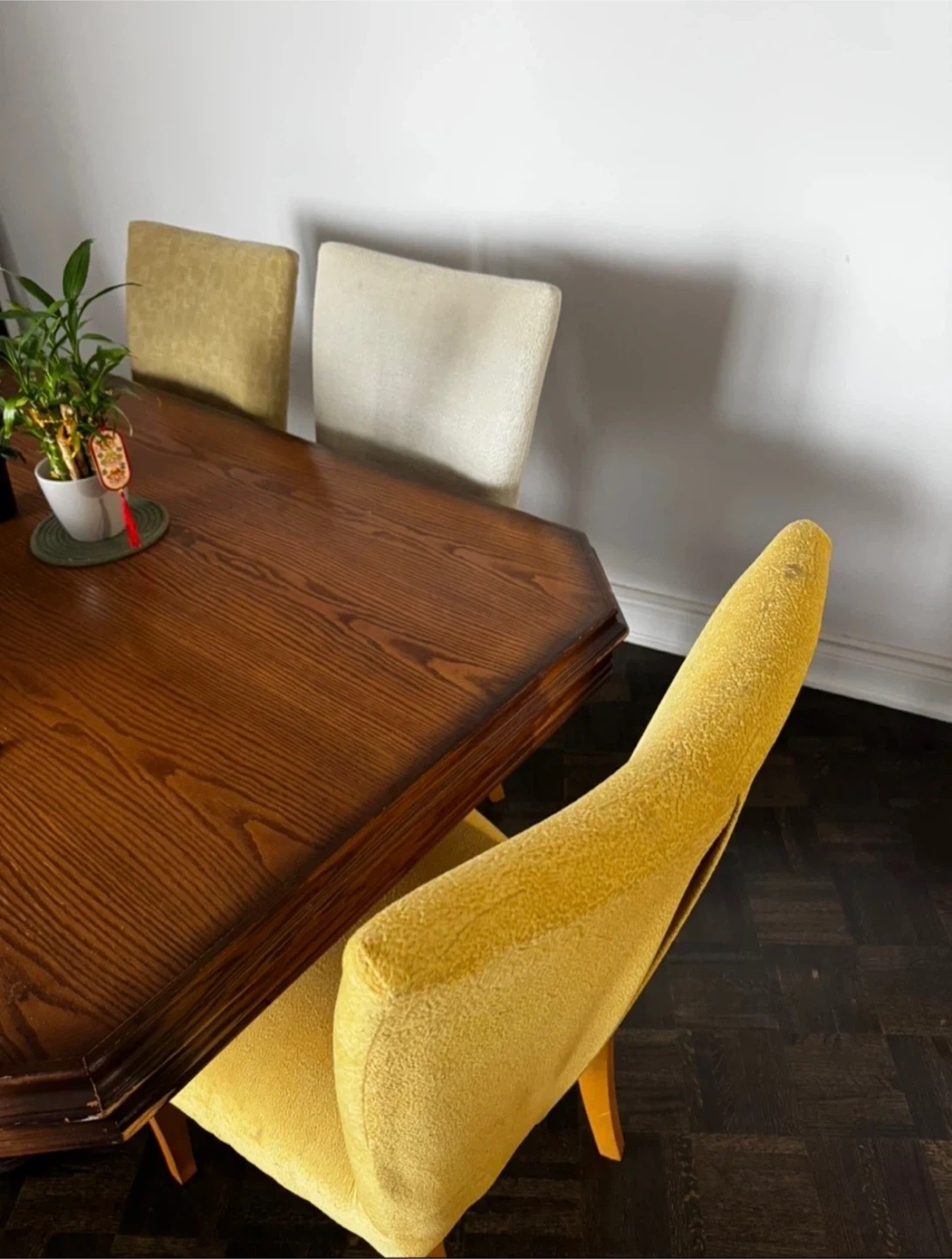 This set includes a sturdy wooden dining table with ornate legs and four upholstered chairs in green and yellow. The table has a classic wood grain finish and an octagonal shape. Chairs offer comfortable seating for family dinners or gatherings.