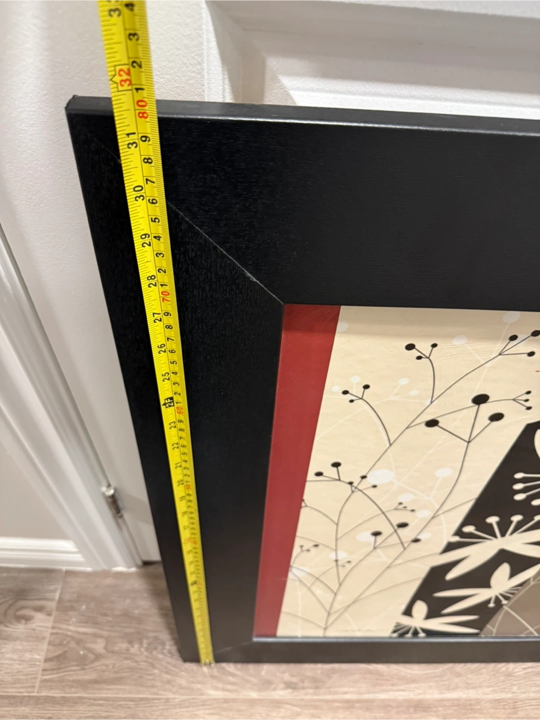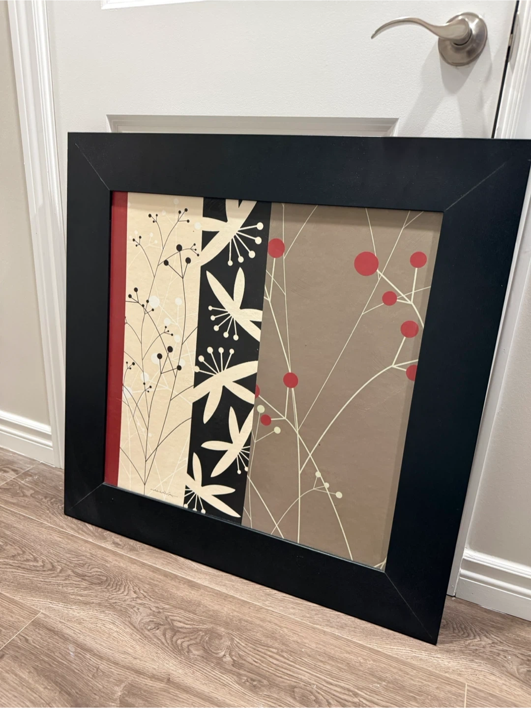 This framed wall art features a modern botanical design with a black frame. It measures approximately 31.5 inches height and width. See pictures of measurement. The artwork includes a mix of black, white, beige, and red tones, adding a stylish touch to any room. It's ready to hang and enhance your decor!