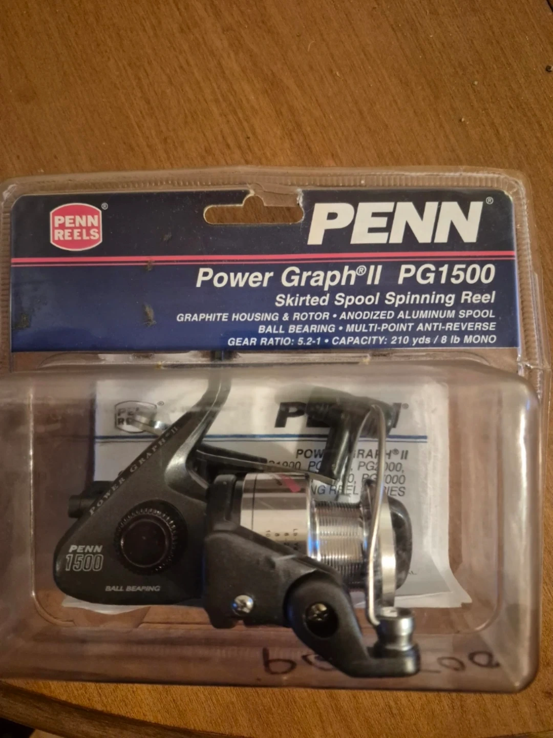 This is a new PENN Power Graph II PG1500 skirted spool spinning reel. It has a graphite housing and rotor with an anodized aluminum spool. The gear ratio is 5.2:1 and it has a capacity of 210 yds / 8 lb mono. This reel would be useful for anglers looking for a reliable spinning reel.