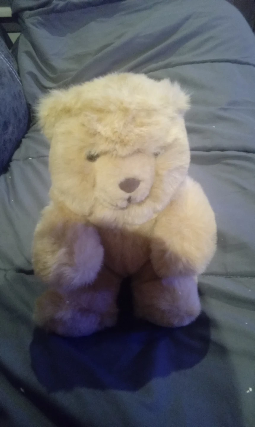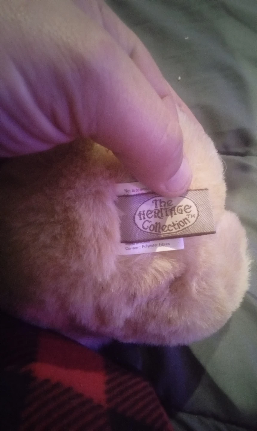 This is a Heritage Collection teddy bear from Ganz Bros. It's made with polyester fibres. This plush toy is a classic bear design.