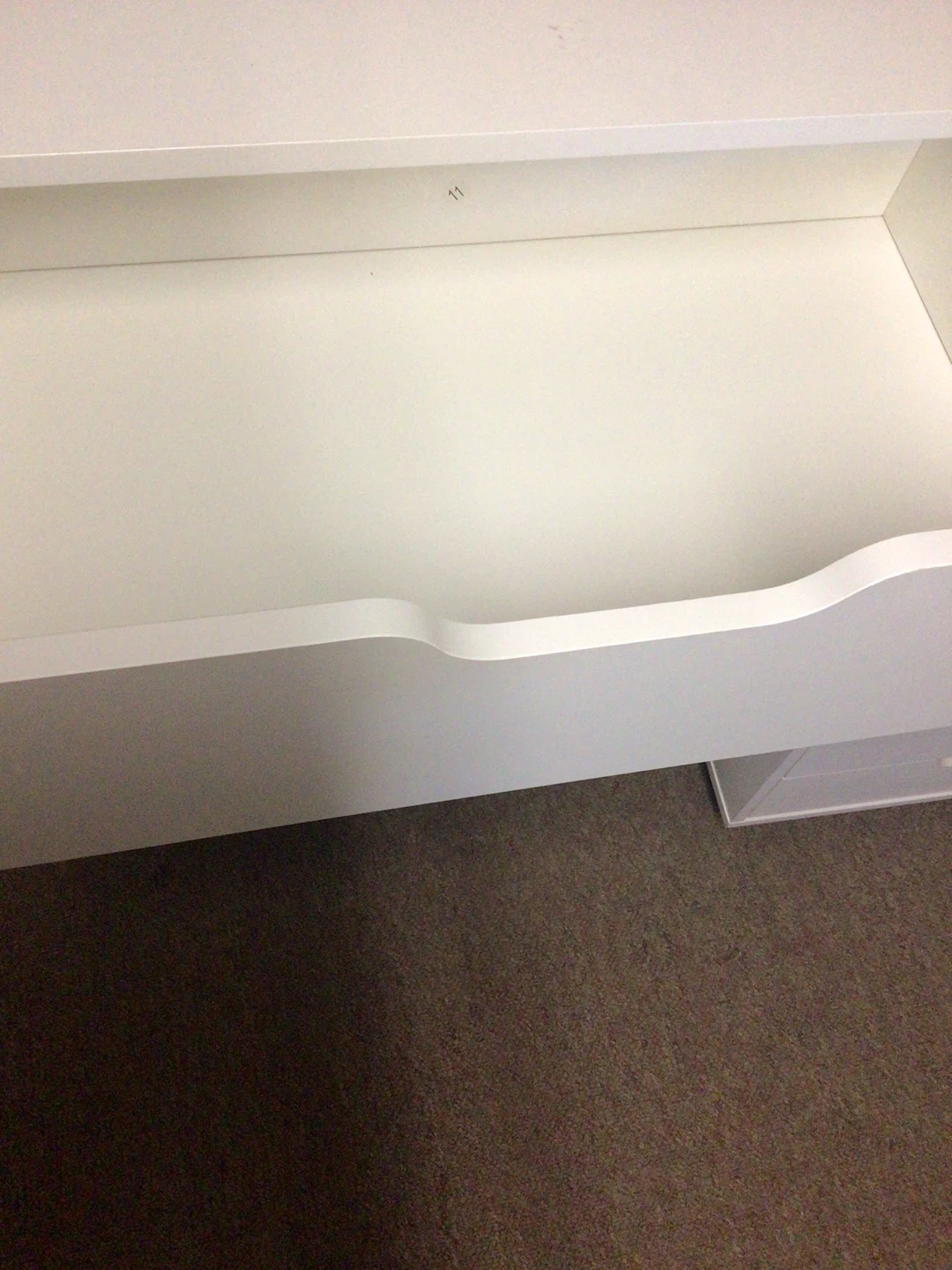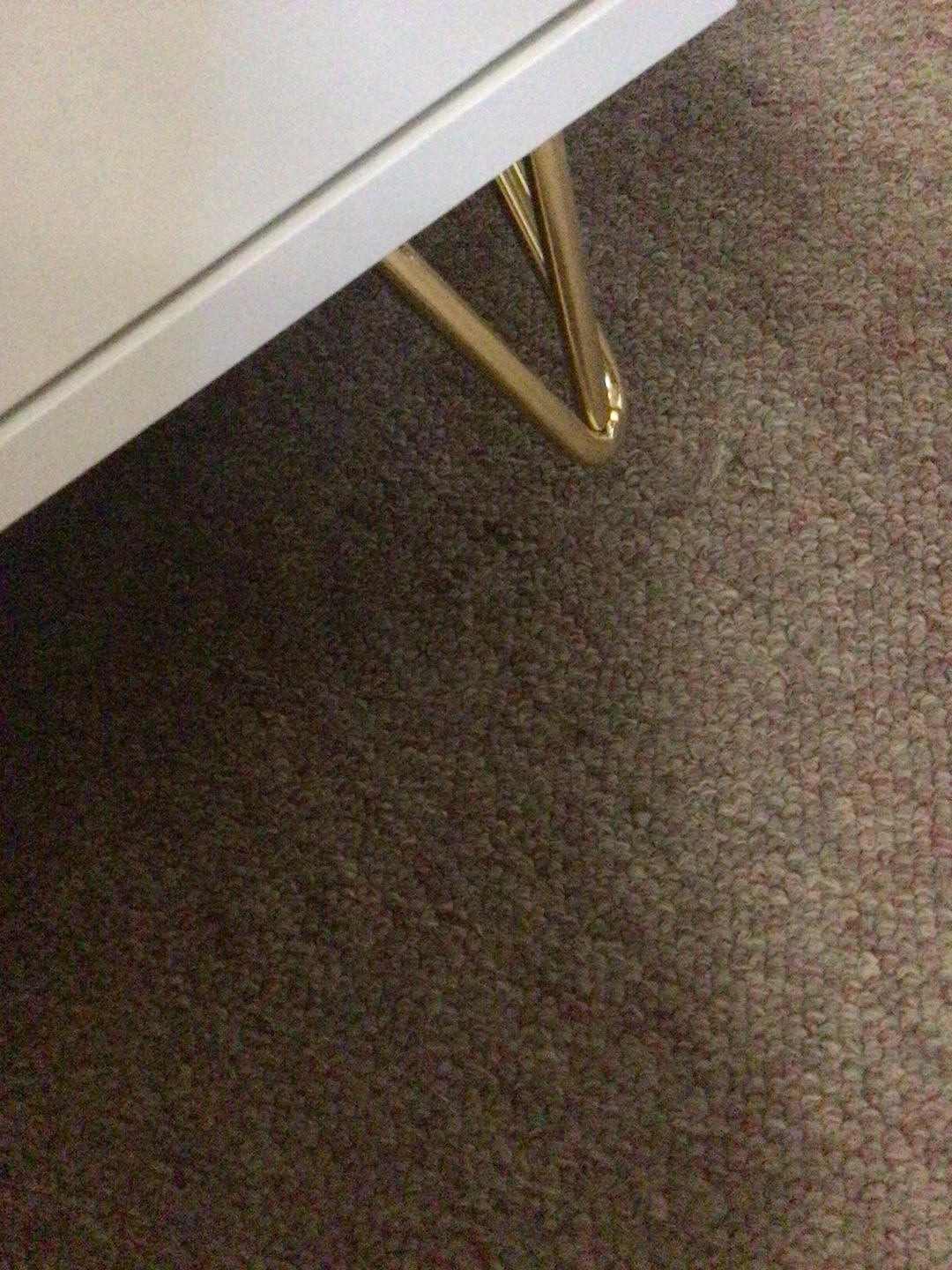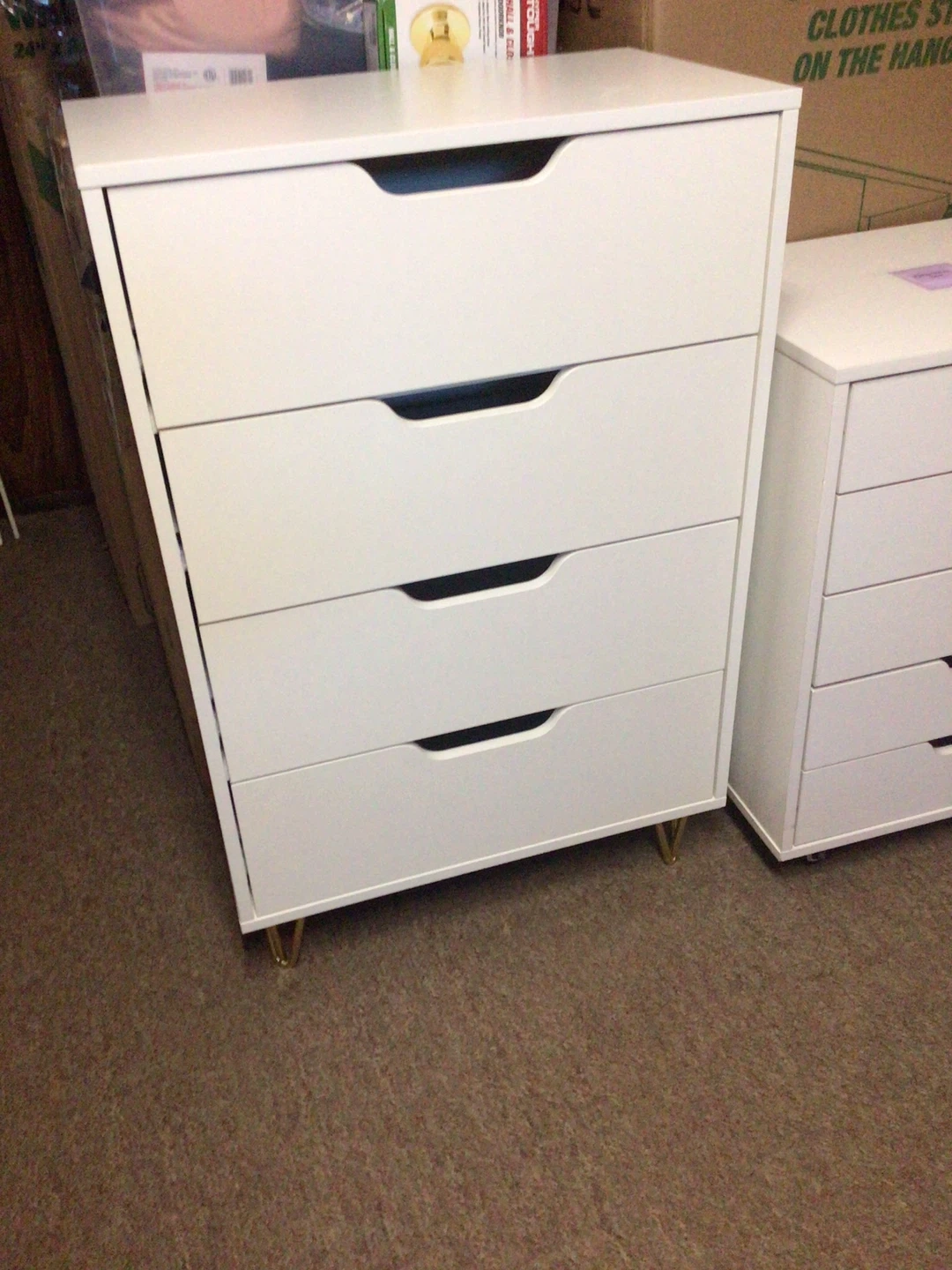 White 4-drawer dresser with modern gold hairpin legs. Drawers have cutout handles for a clean look. Offers ample storage space for clothes or other items. 23 1/2" W x 13 1/2" D x 36" H.
