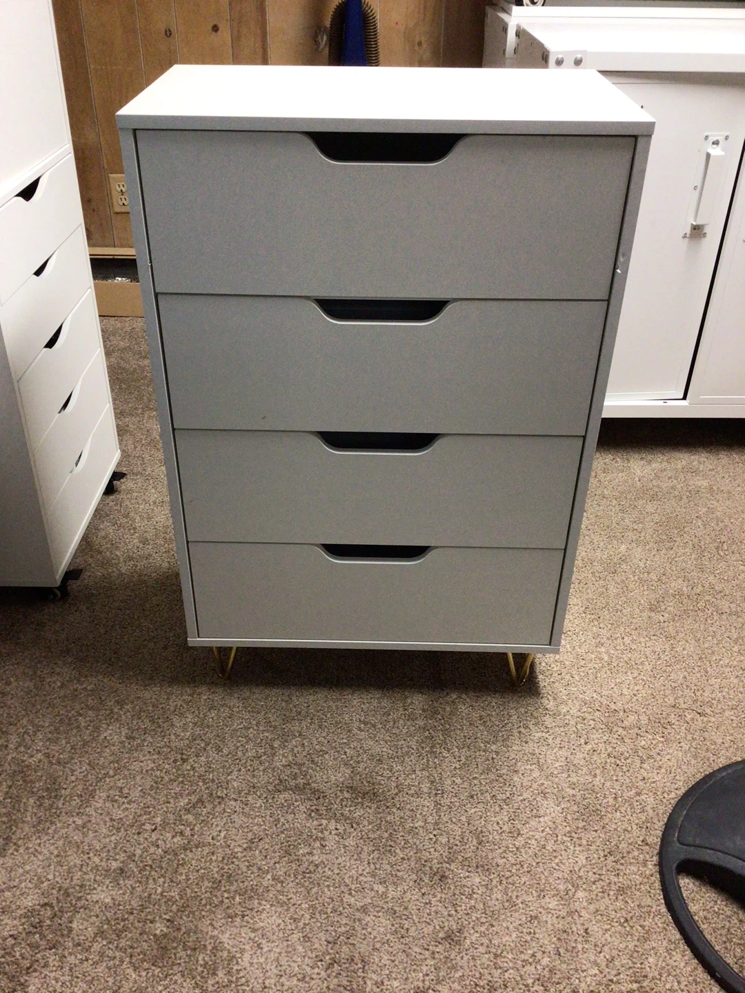 White 4-drawer dresser with modern gold hairpin legs. Drawers have cutout handles for a clean look. Offers ample storage space for clothes or other items. 23 1/2" W x 13 1/2" D x 36" H.