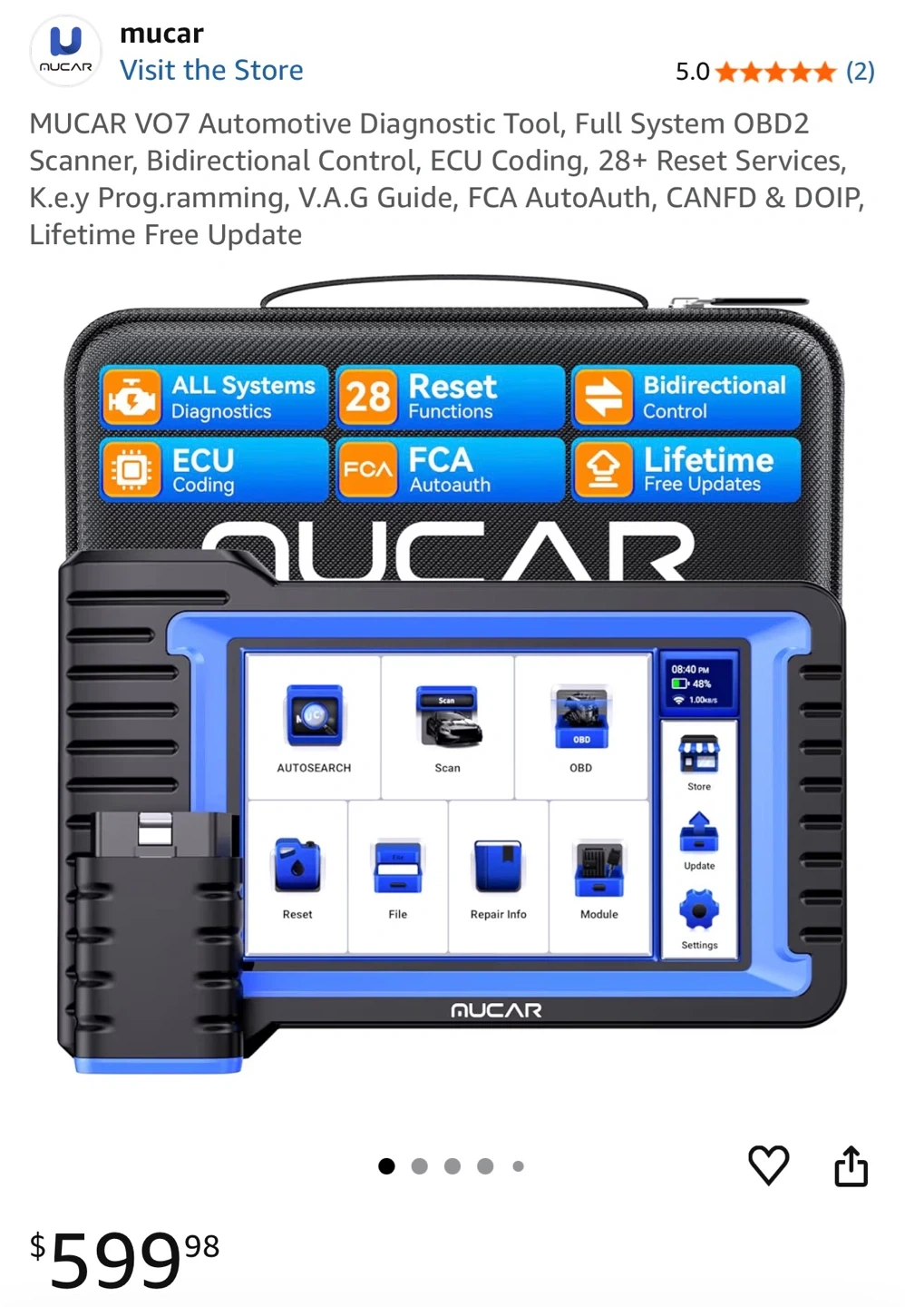 MUCAR VO7 automotive diagnostic tool for full system OBD2 scanning. It supports bidirectional control, ECU coding, and 28+ reset services. Includes a carrying case and accessories for lifetime free updates.