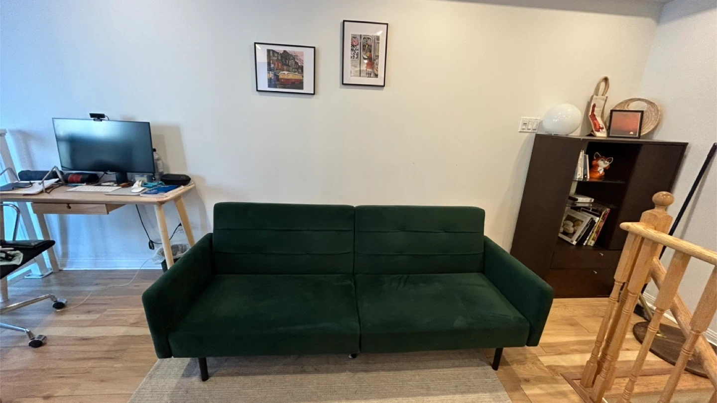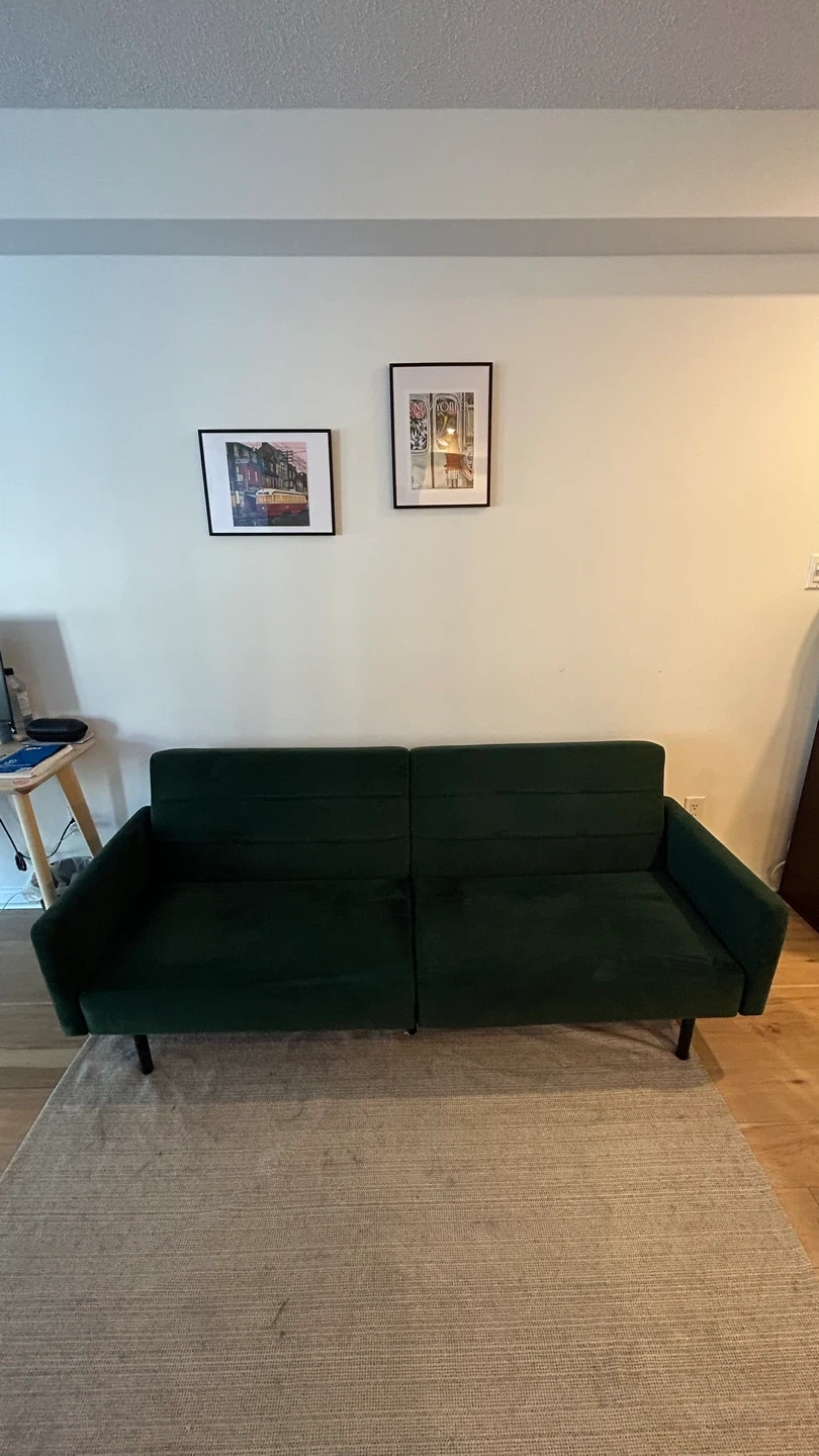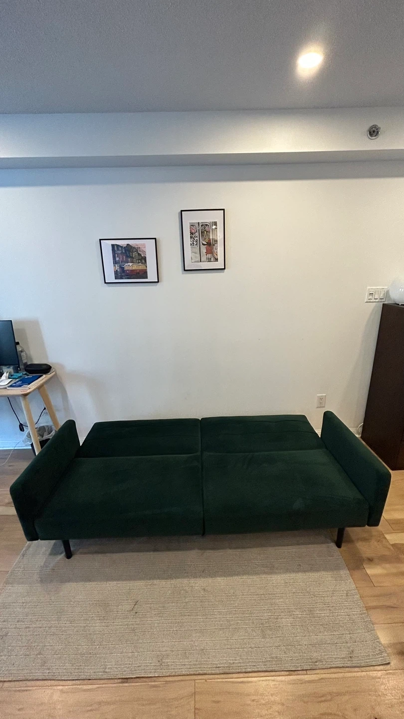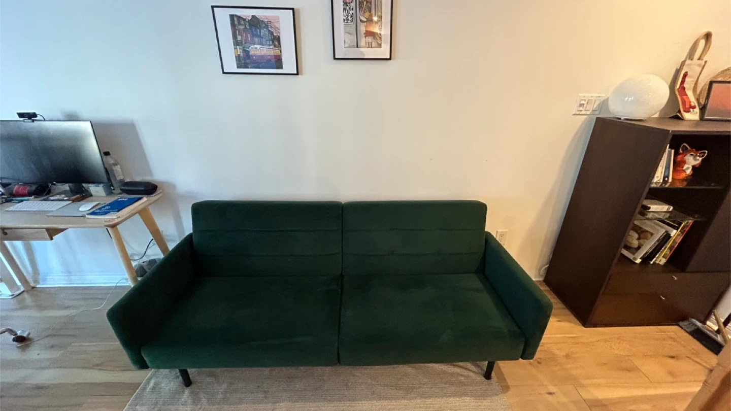 This green velvet futon sofa bed offers a stylish and functional seating solution. It's upholstered in soft velvet fabric and features a tufted design for added detail. The sofa easily converts into a bed, making it perfect for small spaces or guest rooms!