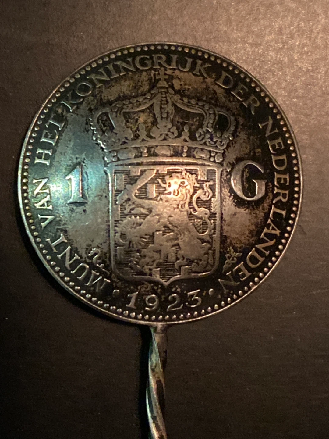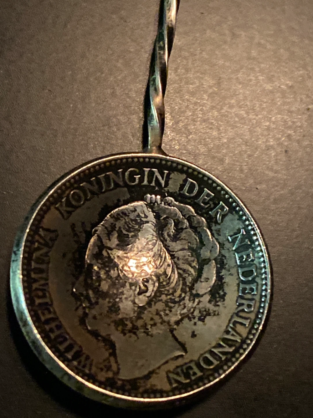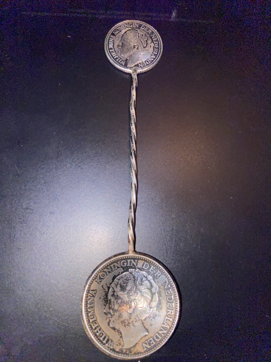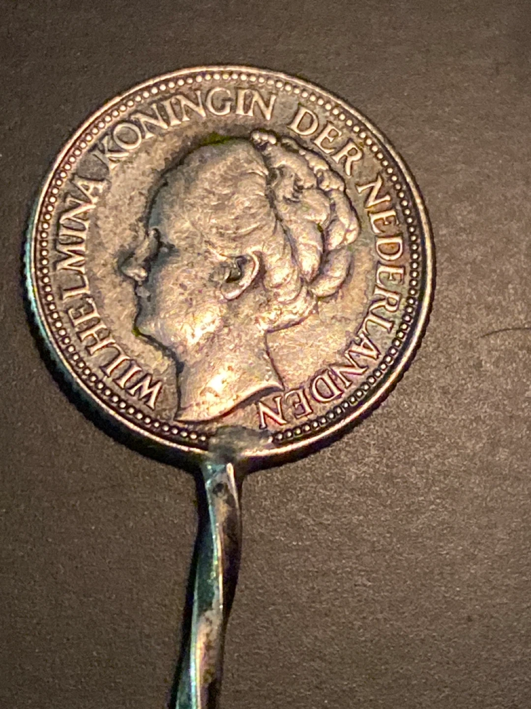 This is a decorative spoon featuring a vintage silver Dutch coin. The coin depicts Wilhelmina, Queen of the Netherlands. The spoon's handle has a twisted design. It's a unique collectible piece.