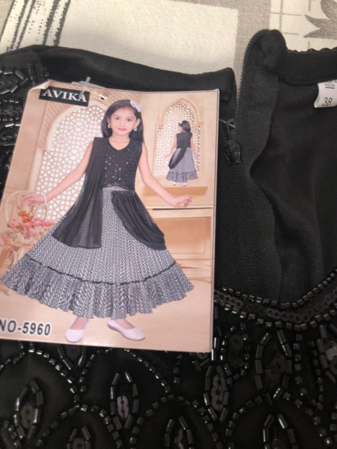 A beautiful formal dress for a young girl. Features a black sleeveless bodice with intricate beadwork. Included is a patterned skirt and a matching sheer black shawl. Consider this a perfect option for your young one’s next Eid