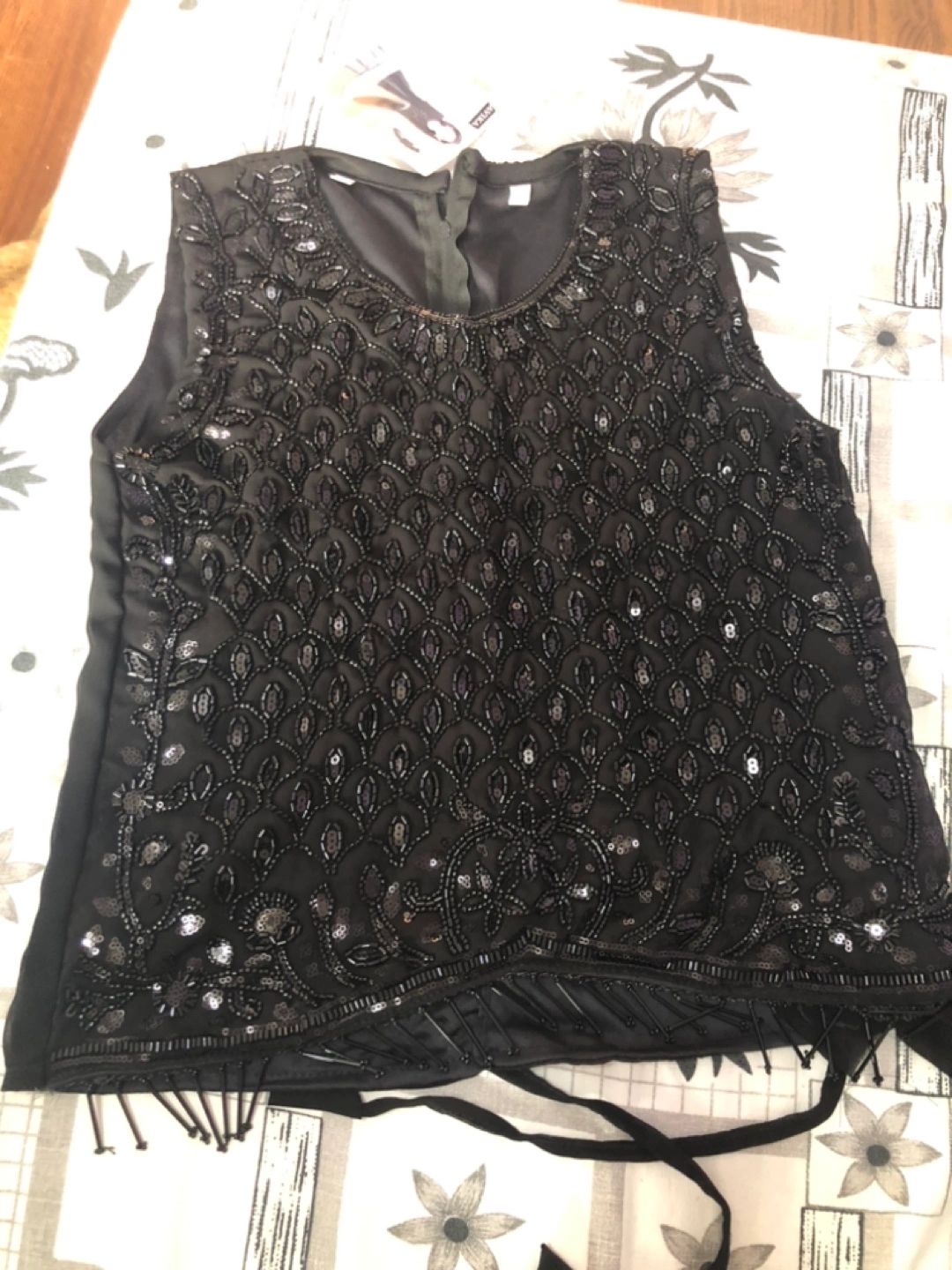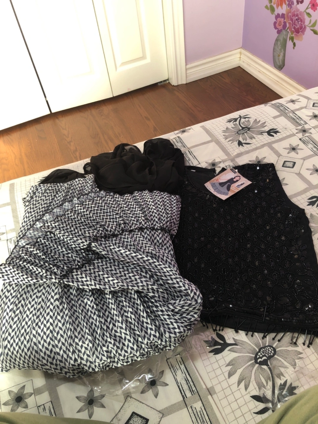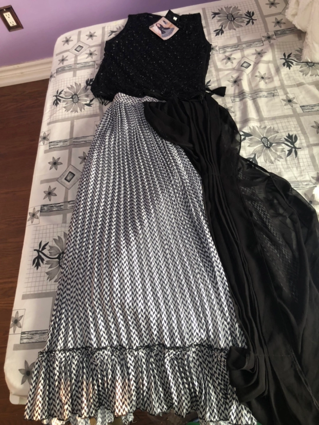 A beautiful formal dress for a young girl. Features a black sleeveless bodice with intricate beadwork. Included is a patterned skirt and a matching sheer black shawl. Consider this a perfect option for your young one’s next Eid