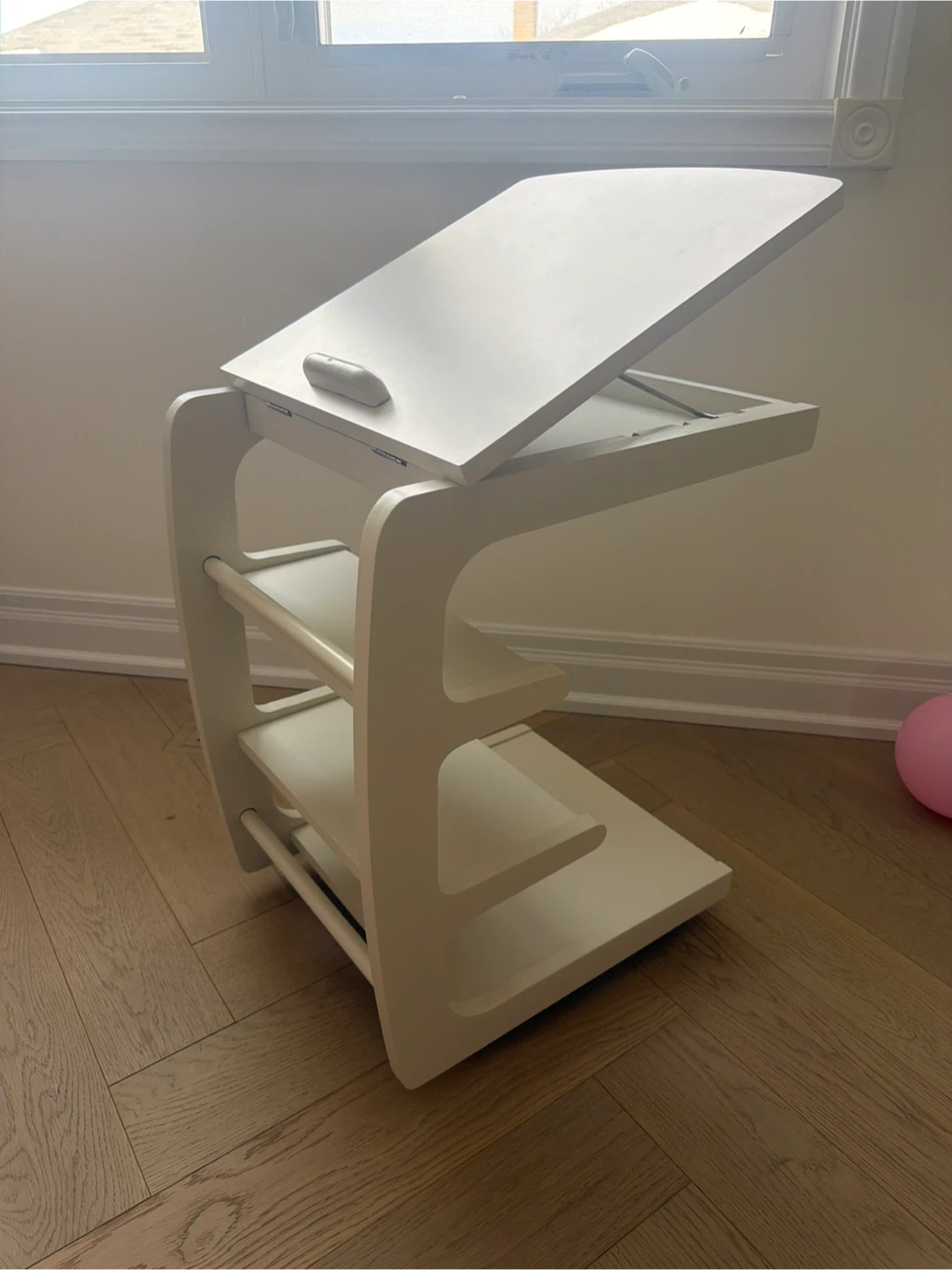 This is a versatile white easel and desk designed for toddlers. It has a tilting surface for drawing and writing. There are two shelves below for storing art supplies or books. It's a great piece for encouraging creativity!