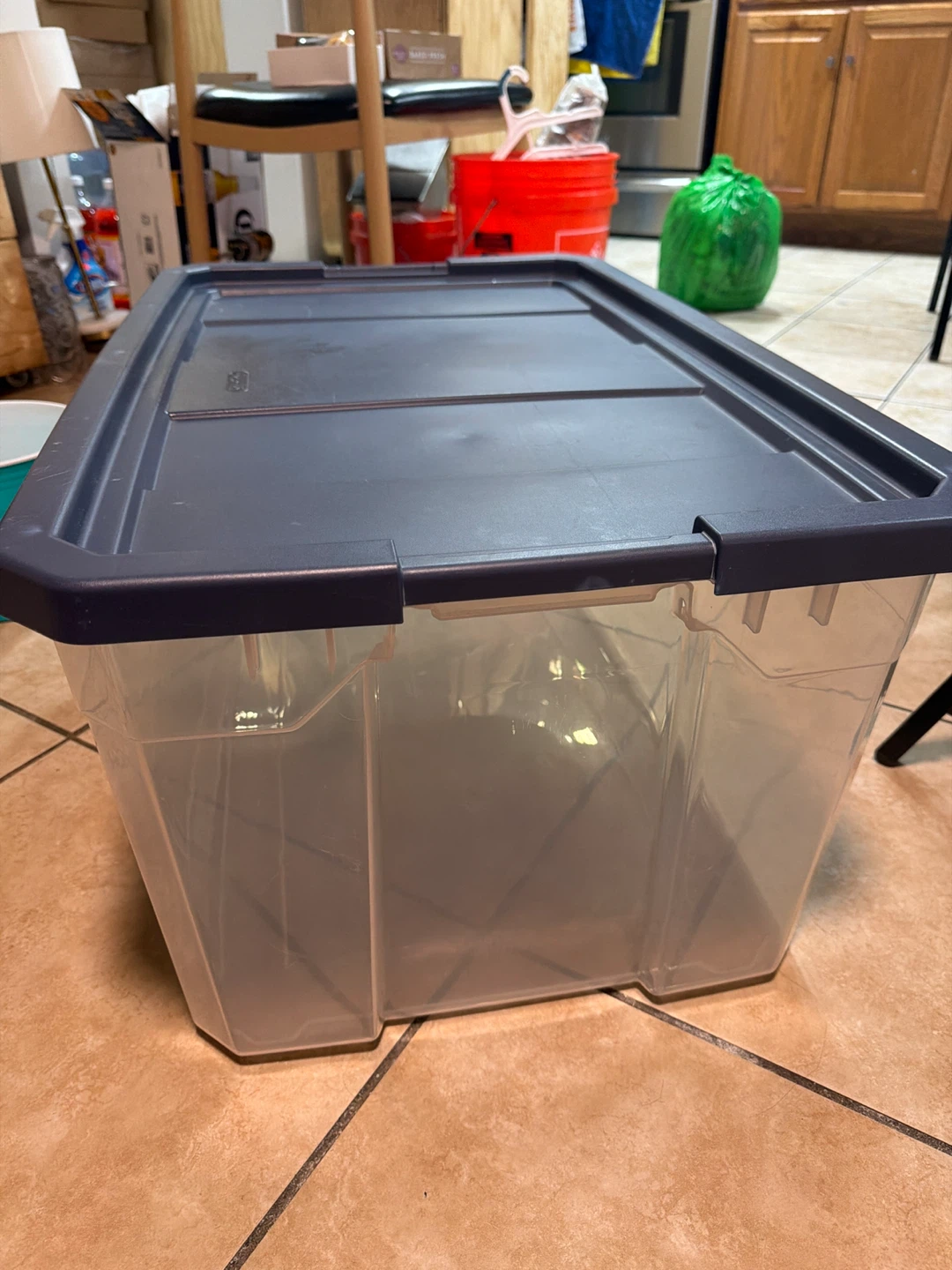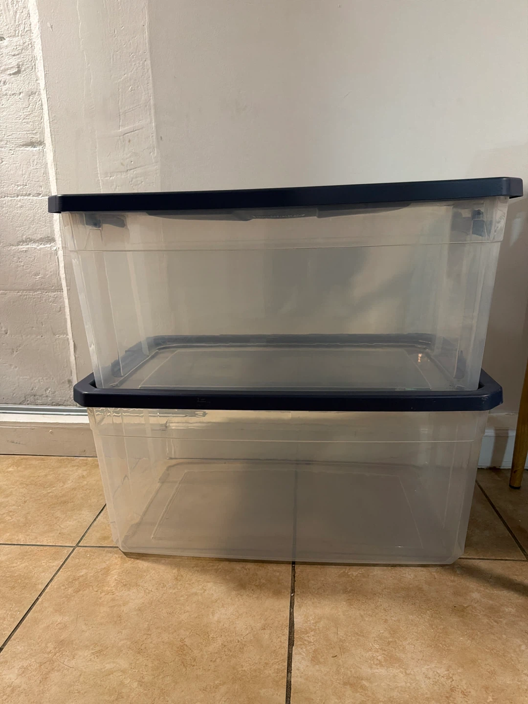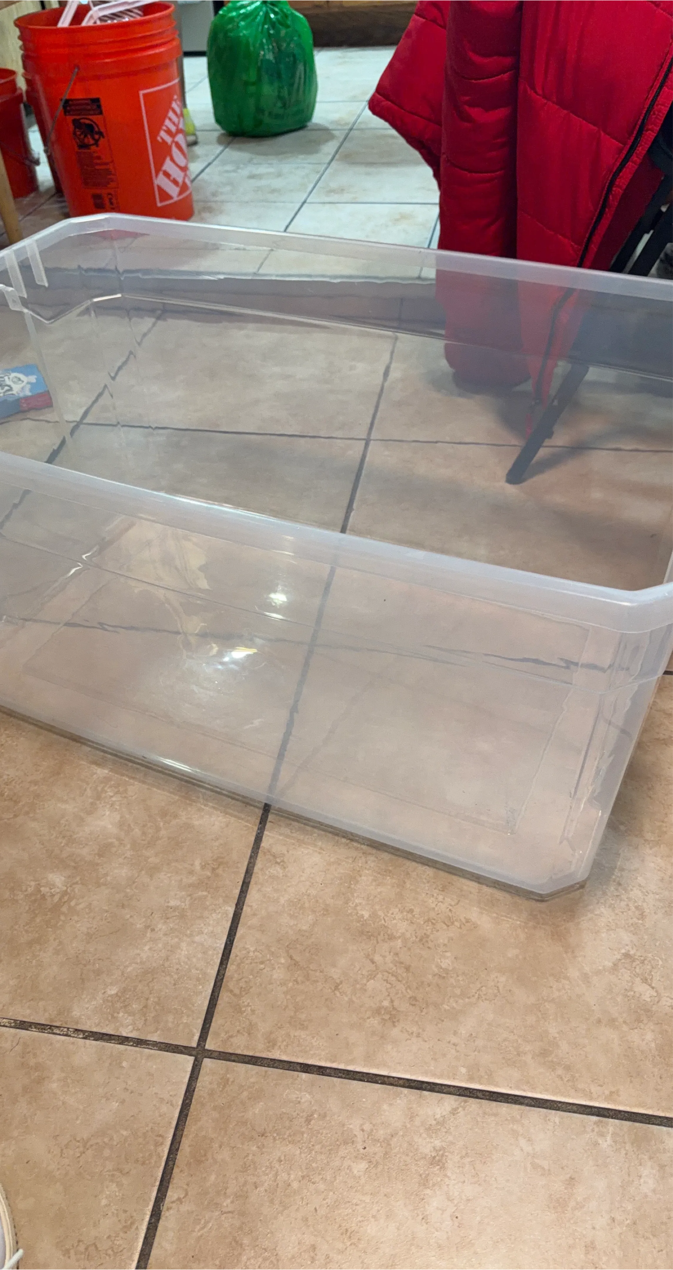 Selling a clear plastic storage container. It comes with a lid to keep your items safe and organized. Perfect for storing clothes, toys, or household goods! I have two completely