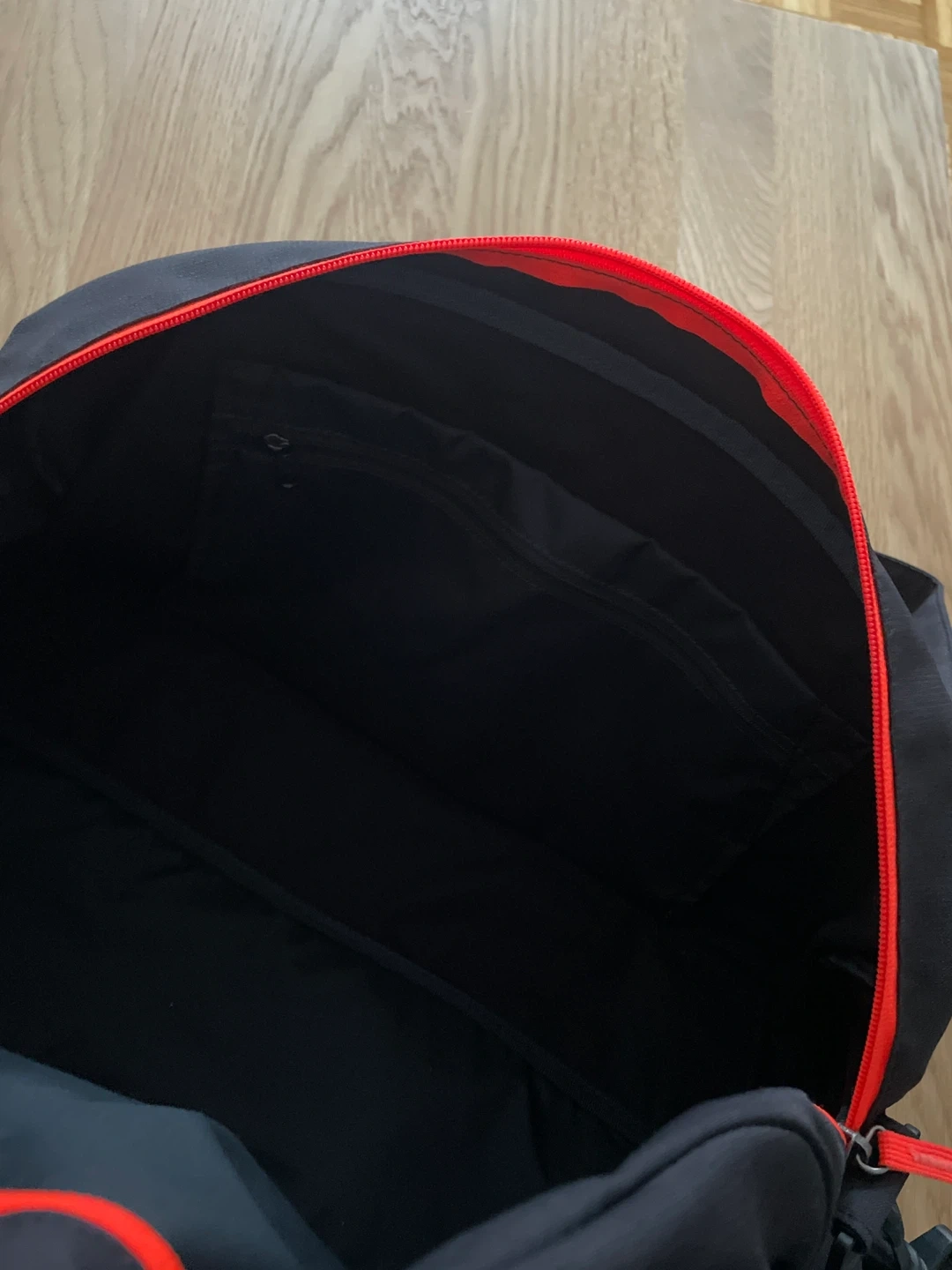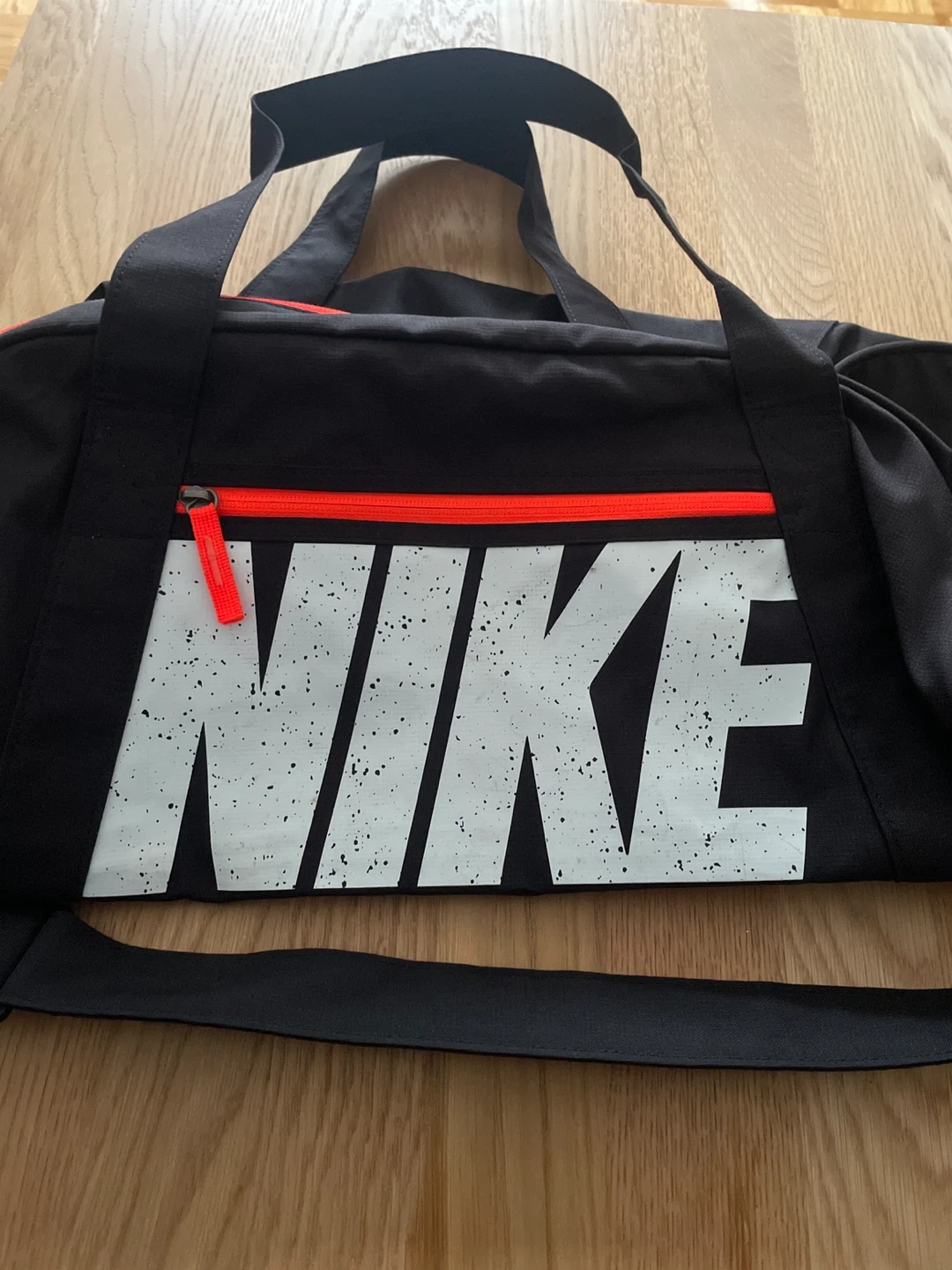 This is a black Nike duffle bag with bright orange accents. It's got a spacious main compartment and a handy front zippered pocket. Great for gym sessions or weekend trips!