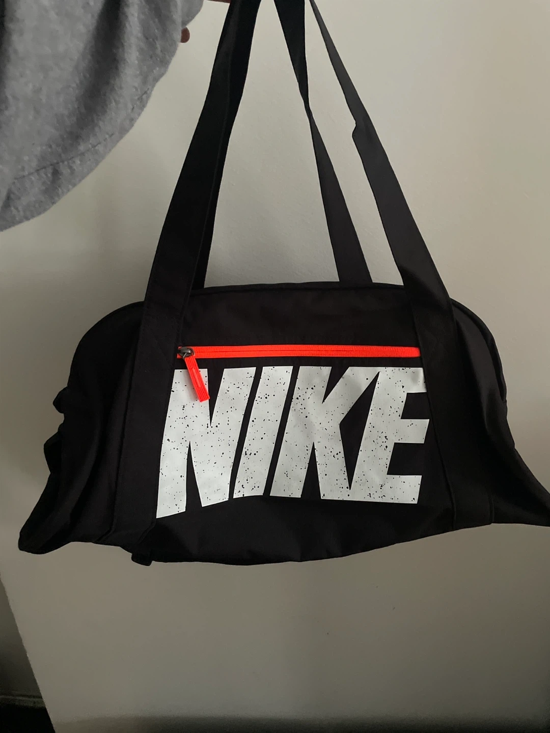 This is a black Nike duffle bag with bright orange accents. It's got a spacious main compartment and a handy front zippered pocket. Great for gym sessions or weekend trips!