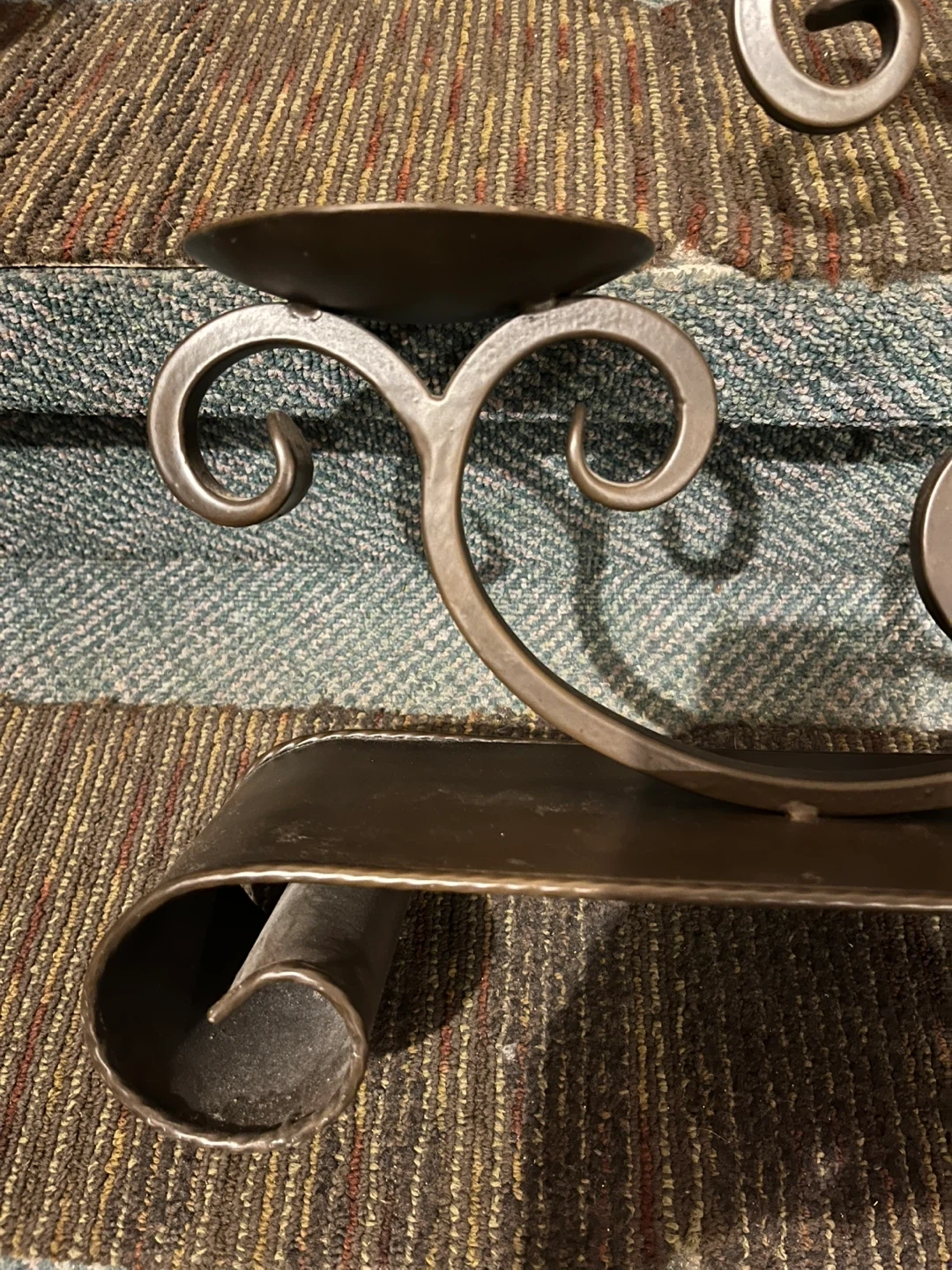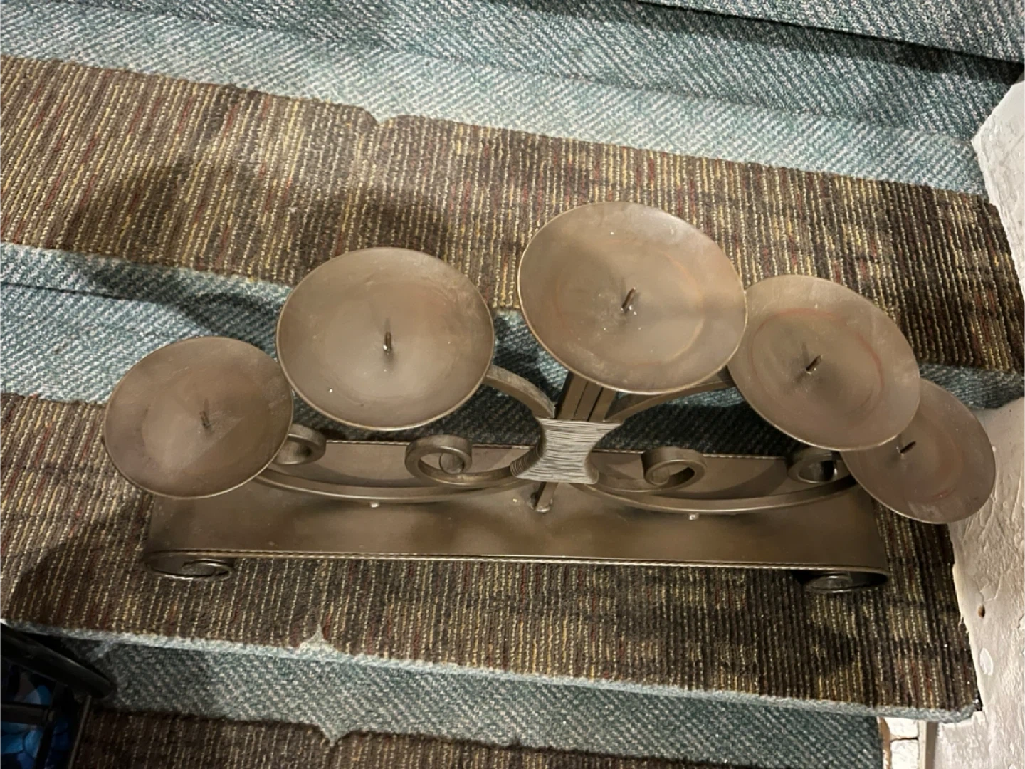 Selling a metal candle holder that can hold up to 5 candles. It has a lovely, rustic design with curled metal accents. Perfect for adding a touch of warmth to any room!