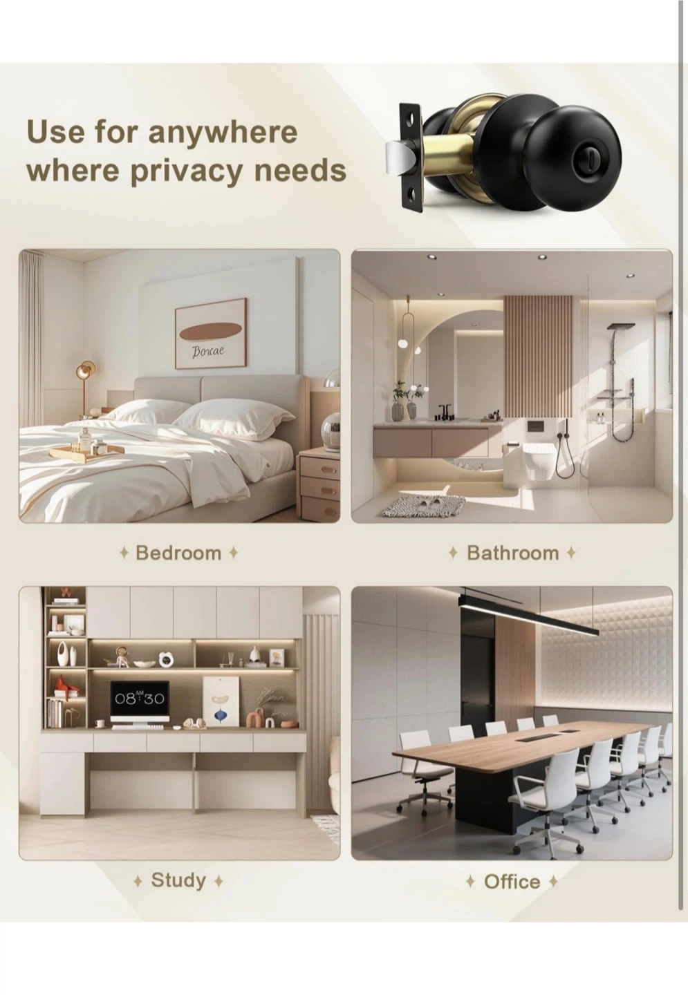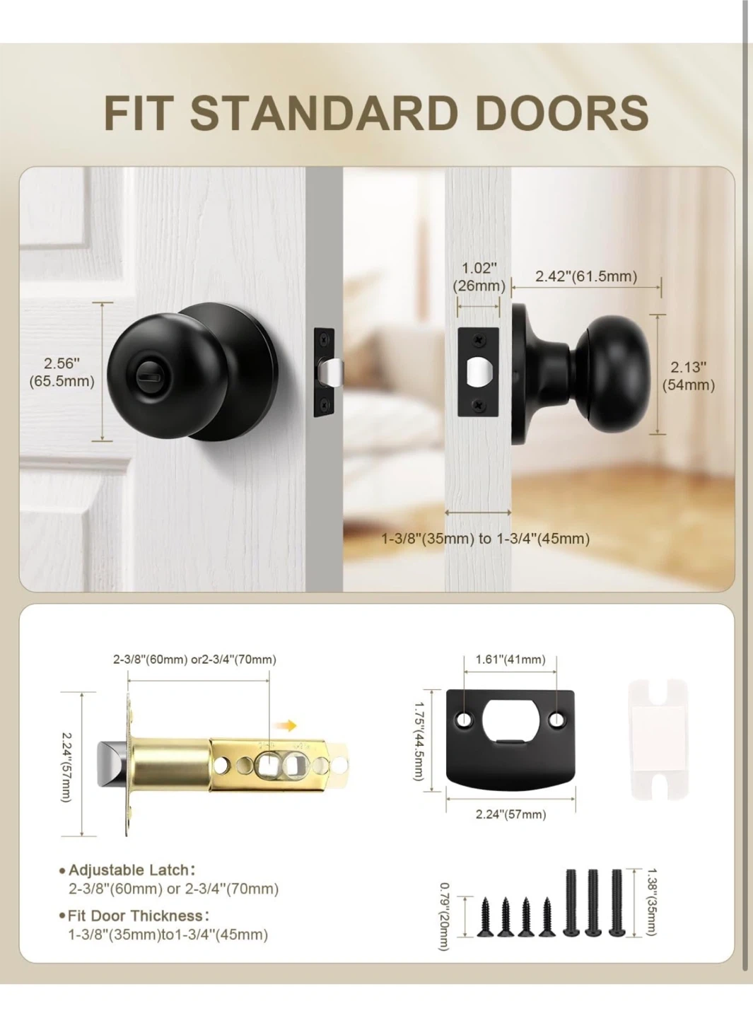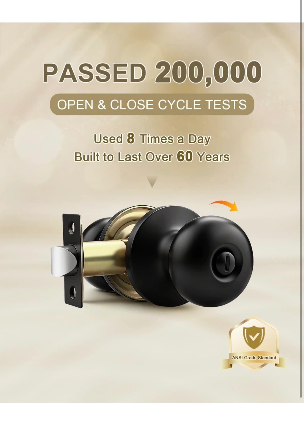 These door knobs feature a privacy function, lockable with a thumb turn from the interior and unlockable with a screwdriver from the exterior. Constructed with stainless steel latches and a matte black smooth finish. Passed 200,000 open & close cycle tests. Built to last over 60 years.