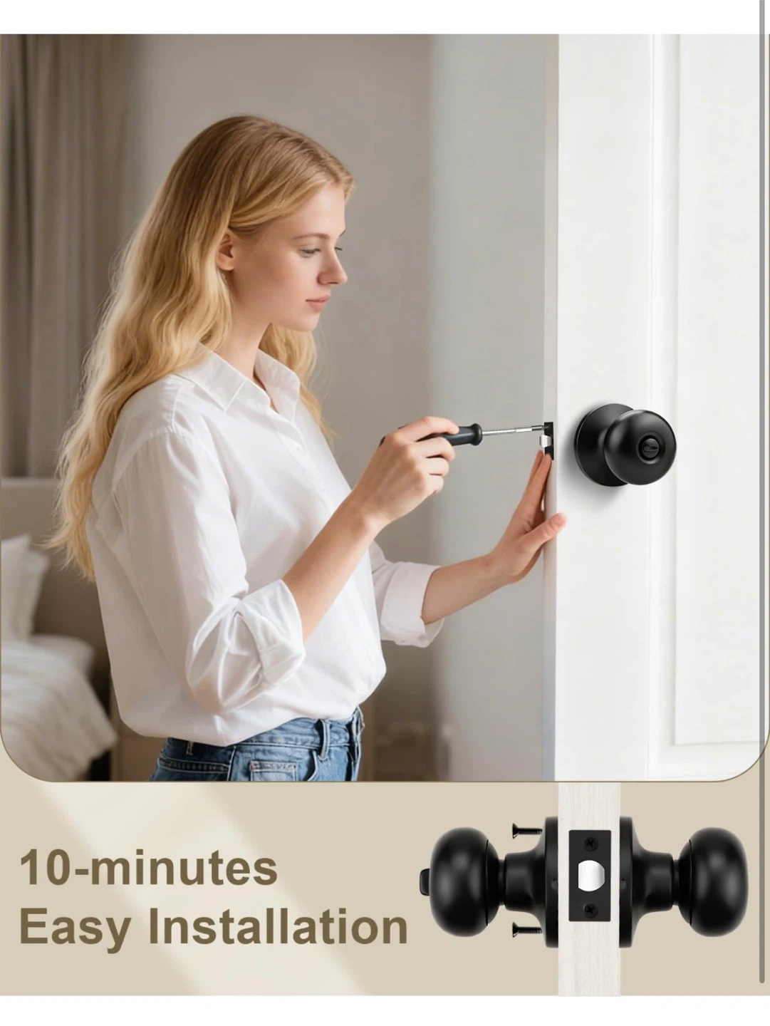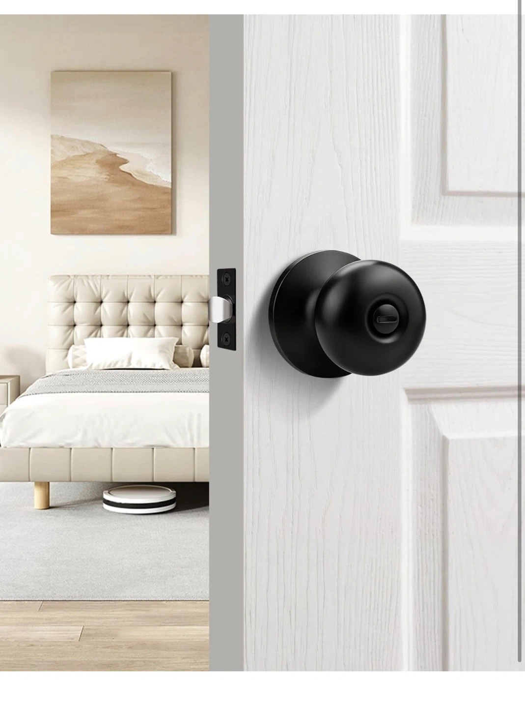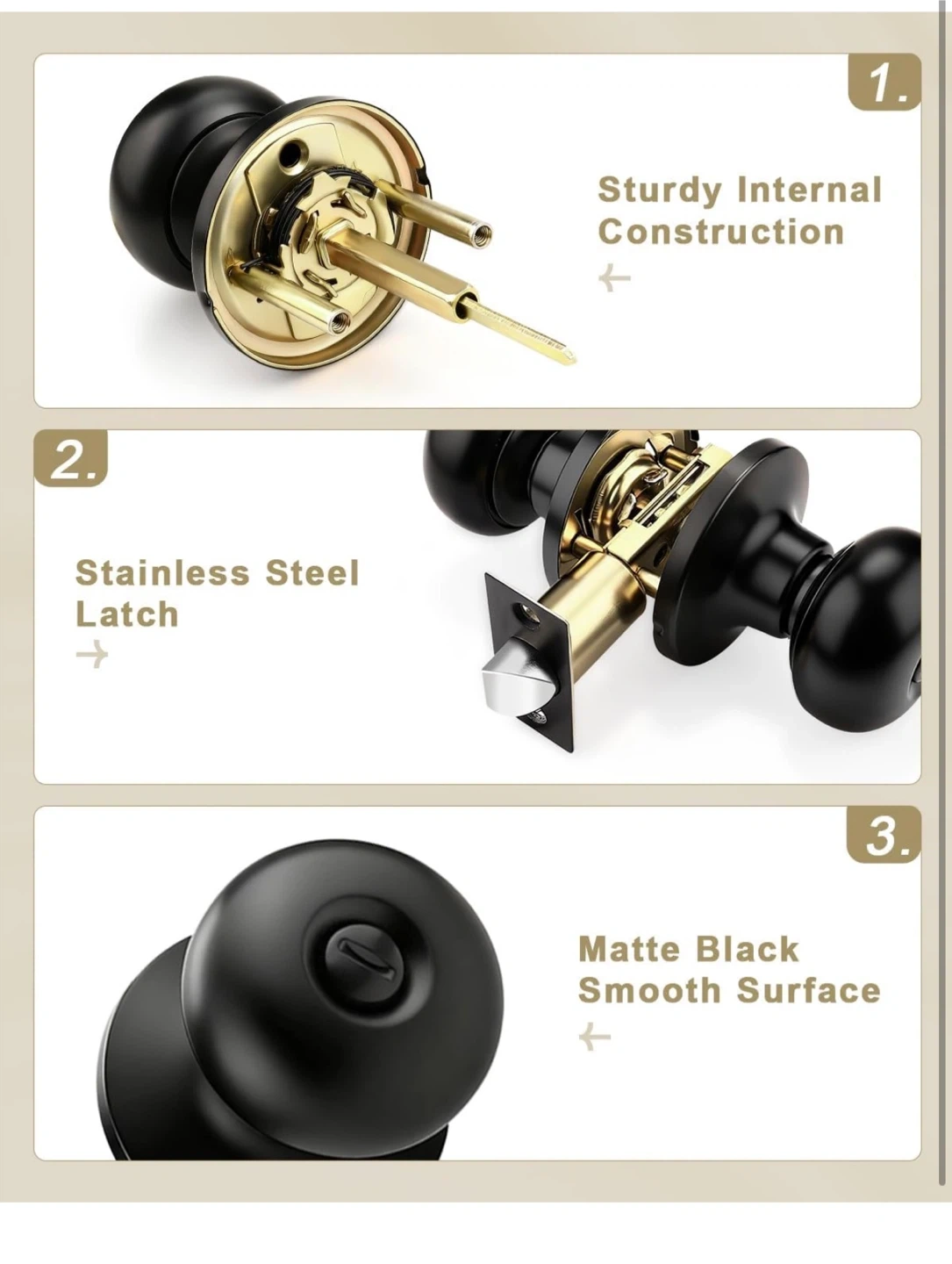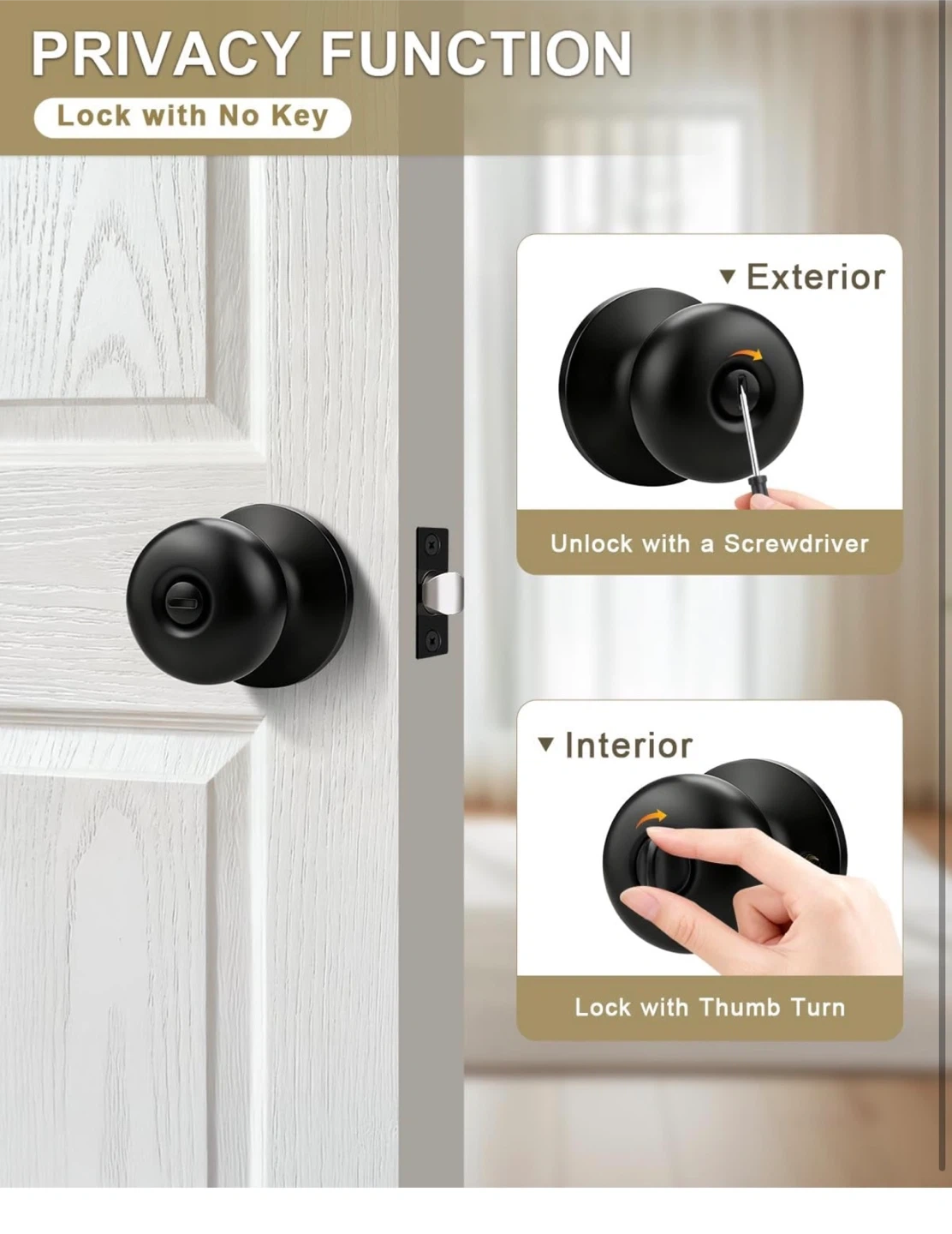 These door knobs feature a privacy function, lockable with a thumb turn from the interior and unlockable with a screwdriver from the exterior. Constructed with stainless steel latches and a matte black smooth finish. Passed 200,000 open & close cycle tests. Built to last over 60 years.