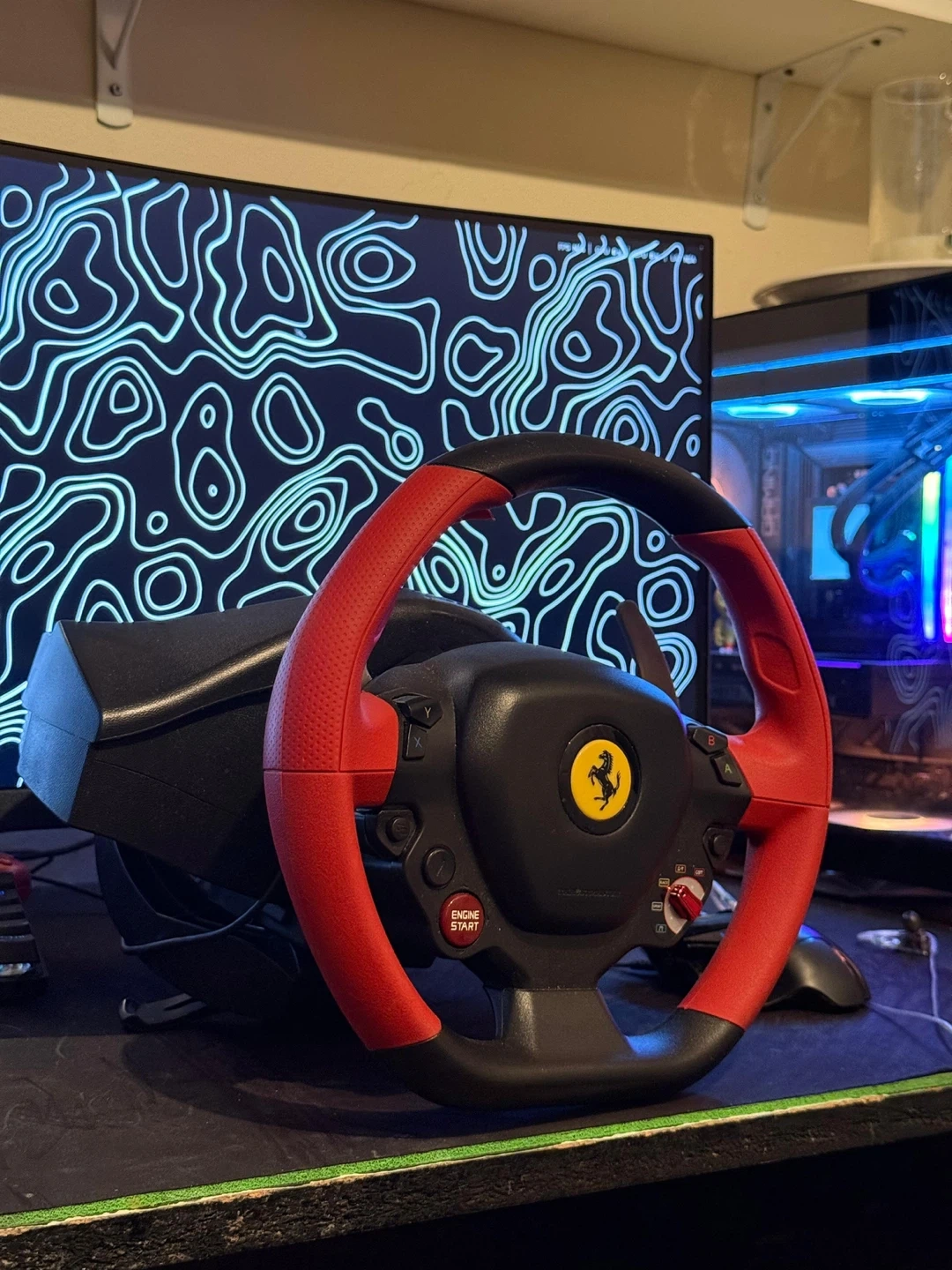 This is a Ferrari branded racing wheel. It features a red and black design with the iconic Ferrari logo. Includes the 'Engine Start' button. Perfect for sim racing enthusiasts!