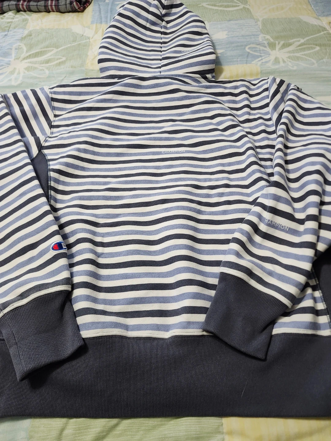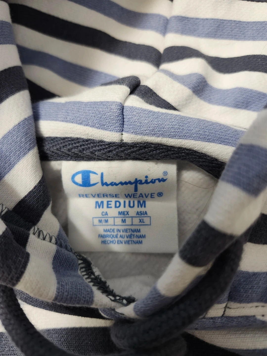 Champion Reverse Weave hoodie with blue and white stripes. It's a size medium. Cotton blend material.