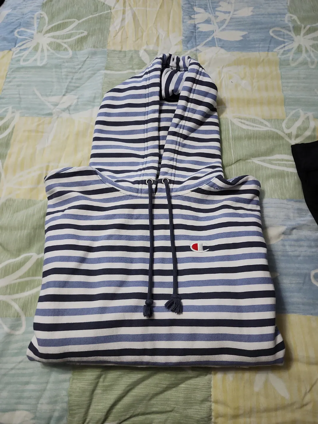 Champion Reverse Weave hoodie with blue and white stripes. It's a size medium. Cotton blend material.