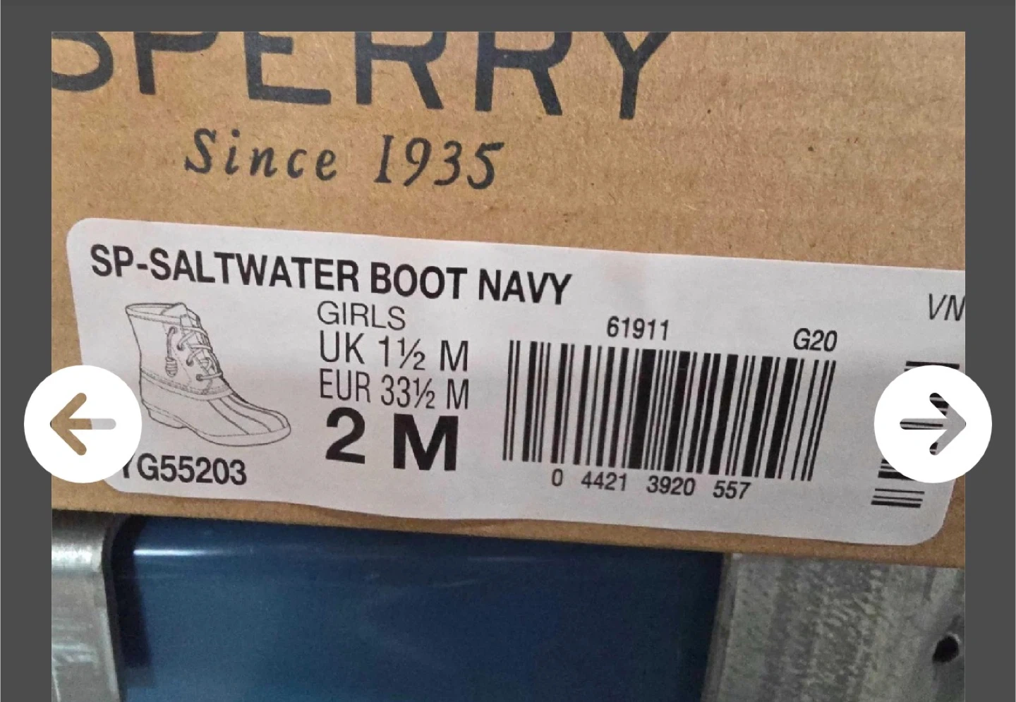 Buy & SellSperry Saltwater Boot Navy, Girls Size 2Sperry Saltwater Boot Navy, Girls Size 2$59Selling a pair of Sperry Saltwater Boots in navy for girls, size 2M. These boots are in great condition and come with the original boxConditionNewWHERE TO MEETCheck LocationView MapSELLERverifiedMoeAcademy Place1154 reviews0 chats·1 favorites·8 viewsSEND CHAT TO SELLERHi Moe! I’m interested in your listing.Hi Moe! I’m interested in your listing.Get the Karrot app to chatSign In to chat