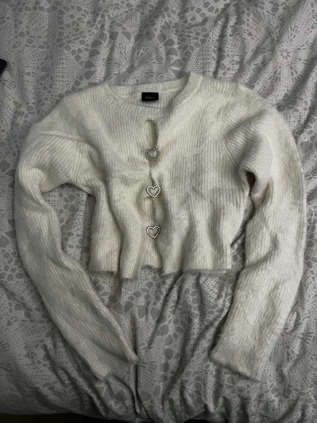 Super soft white fuzzy cropped cardigan. Has three rhinestone heart buttons between small slits. Size Medium. Price negotiable.