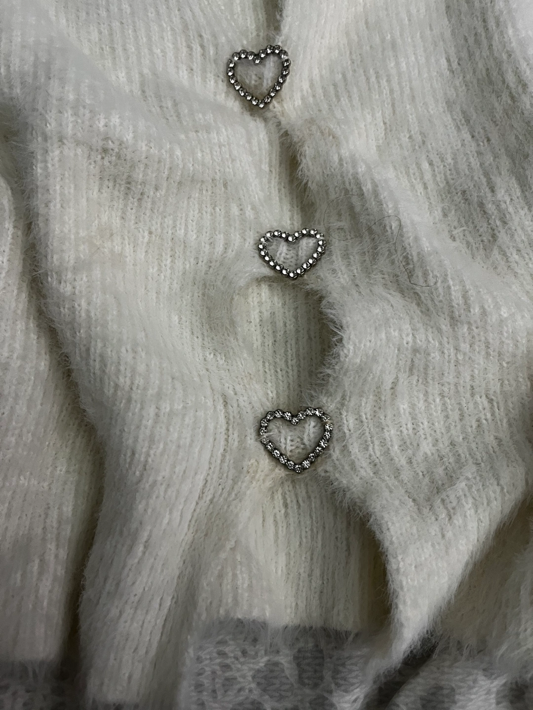Super soft white fuzzy cropped cardigan. Has three rhinestone heart buttons between small slits. Size Medium. Price negotiable.