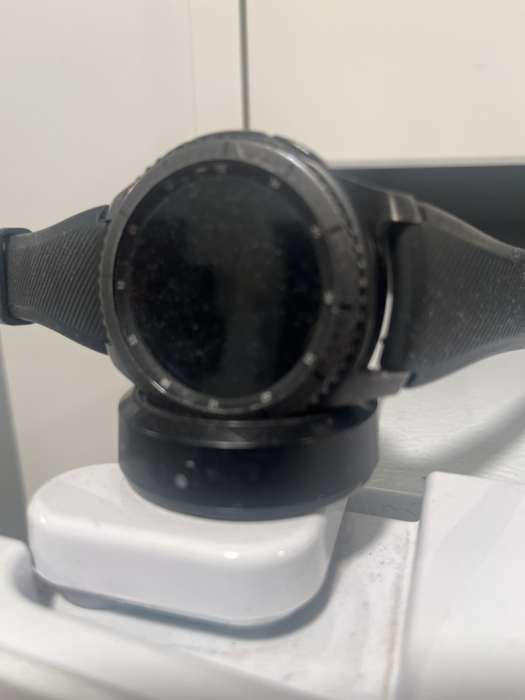 Black smartwatch, charging on a white stand. Features a round face and a black silicone band. Pre-owned. New battery new a charger